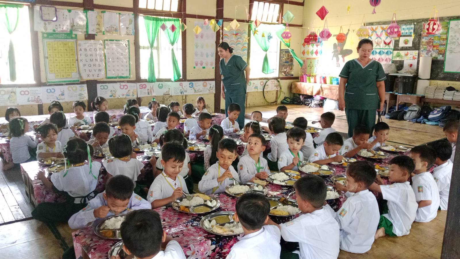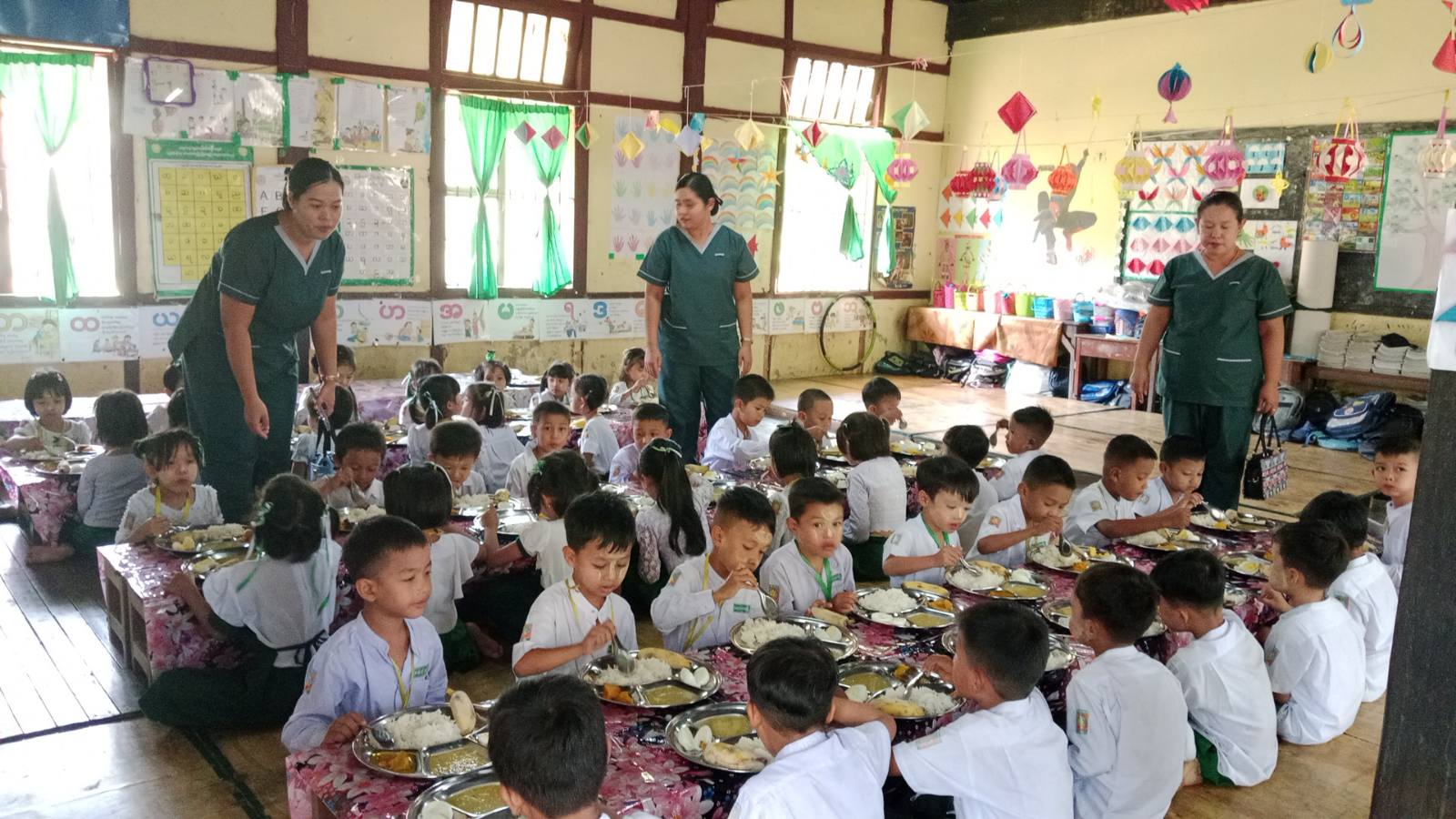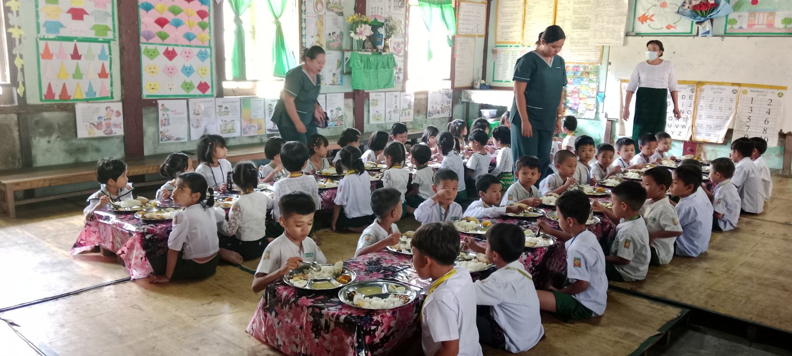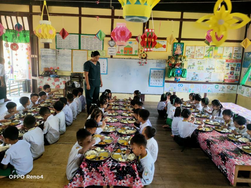 ထိုသို့ အာဟာရကျွေးမွေးရာတွင် အာဟာရပြည့်ဝမျှတ၍ ကျန်းမာရေးနှင့် ညီညွတ်မှုရှိသော ကြက်ဥပြုတ်၊ ပဲဟင်းချို၊ ရွှေဖရုံသီးပေါင်း၊ ဖီးကြမ်း၊ ထမင်း (ပုံစံ-၁)၊ ကြက်သားပေါင်း၊ အသီးအရွက်ကြော်၊ မြေပဲလှော်၊ ပဲဟင်းချို၊ ထမင်း (ပုံစံ-၂) အုပ်စုအလိုက် KG ကျောင်းသား/ ကျောင်းသူ(၆၀၉)ဦးအား ကျန်းမာရေးဝန်ထမ်းများ၊ ဆရာ၊ ဆရာမများနှင့် ကျောင်းအကျိုးတော်ဆောင်များ၊ ကျောင်းသားမိဘများက နေ့လယ်စာ ကျွေးမွေးခဲ့ကြောင်း သိရသည်။