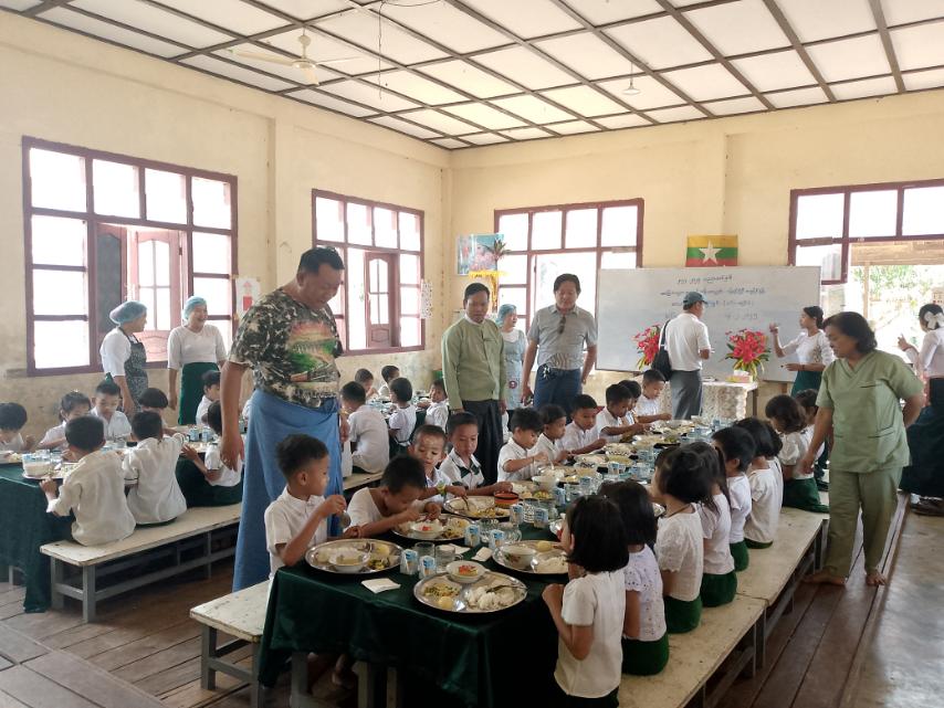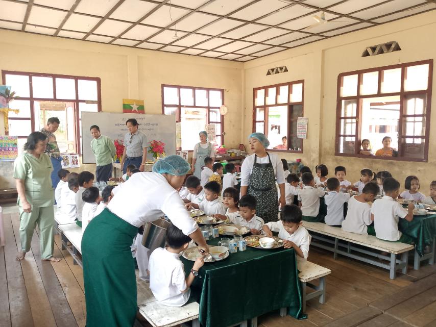 ထိုသို့ ကျောင်းတွင်းအာဟာရကျွေးမွေးရာတွင် (KG)ကျောင်းသား/သူ (၄၅) ဦးတို့အား အစာအာဟာရသုံးအုပ်စုတွင် ပါဝင်သော ထမင်းဆီစမ်း၊ ကြက်ဥ၊ မုန်လာဥနီနှင့် ပန်းဂေါ်ဖီ (အစိမ်းကြော်)၊ ပဲနီလေး (ဟင်းချို)နှင့် ပဲနို့(Lactasoy) တို့ကို နံနက်စာအဖြစ် ကျွေးမွေးခဲ့ရာ အဆိုပါကျွေးမွေးပွဲသို့ မြို့အုပ်ချုပ်ရေးမှူး၊ မြို့ပြည်သူ့ကျန်းမာရေးဦးစီးဌာန၊ ကျန်းမာရေးဝန်ထမ်းများနှင့် ဆရာ/ဆရာမများက လိုက်လံကြည့်ရှုခဲ့ကြသည်။