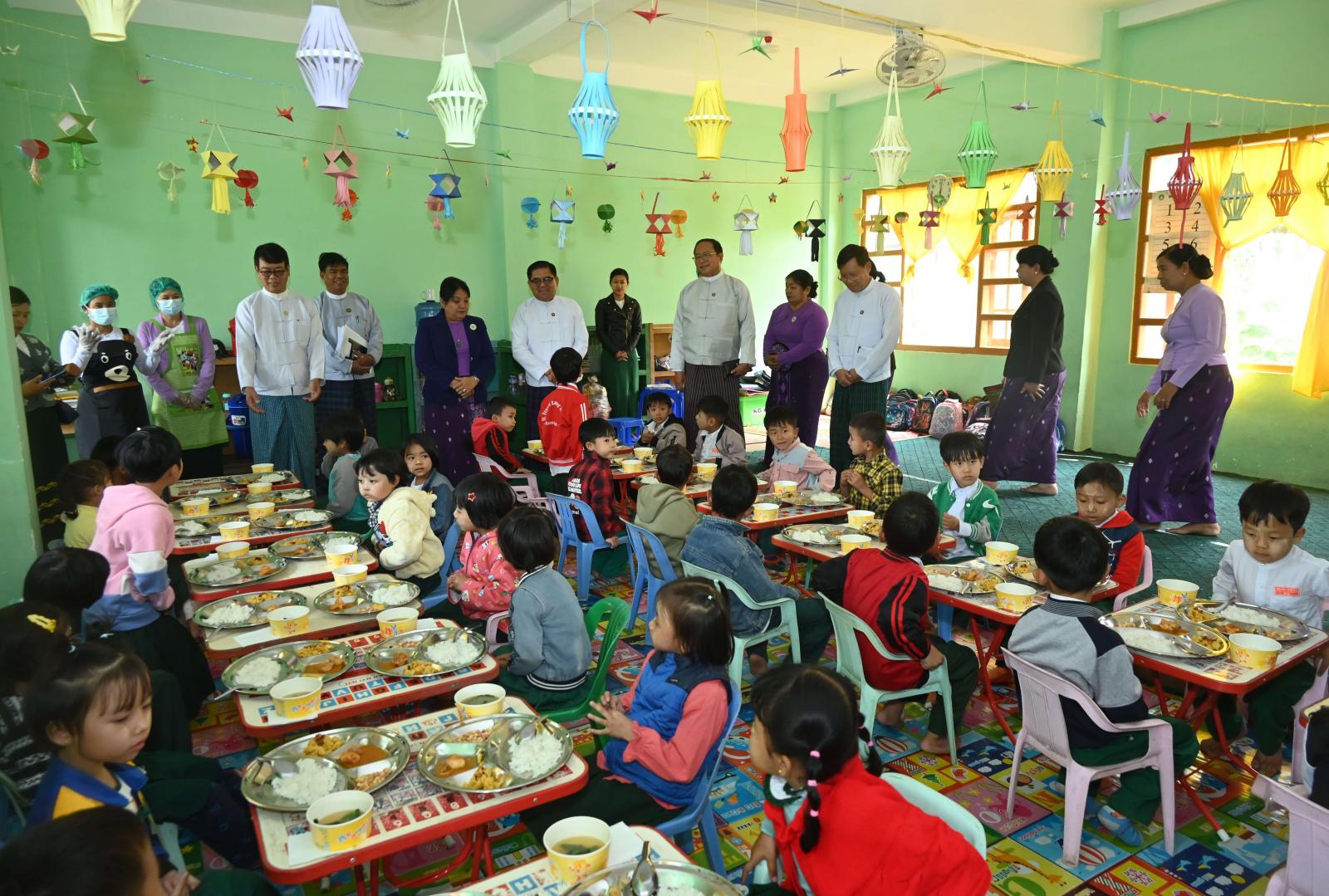 ယင်းနောက် ပြည်နယ်ဝန်ကြီးချုပ်နှင့် ဇနီးဒေါ်နန်ဆိုင်း၊ ပြည်နယ်အစိုးရအဖွဲ့ဝင်ဝန်ကြီးများနှင့် ၎င်းတို့၏ ဇနီးများ၊ ဌာနဆိုင်ရာတာဝန်ရှိသူများသည် ကျန်းမာရေးဝန်ကြီးဌာန၊ ပြည်နယ်ပြည်သူ့ ကျန်းမာရေးဦးစီးဌာနက မူလတန်းကျောင်းသား/ကျောင်းသူများ၏ ကြီးထွားဖွံ့ဖြိုးကျန်းမာမှုနှင့် ပညာရေးတိုးတက်မှုတို့အတွက် ကျန်းမာရေးနှင့်ညီညွတ်သော အစားအသောက်ပုံစံများမြှင့်တင်ရန် ပညာရေးနှင့်ကျန်းမာရေးအပါအဝင် ကဏ္ဍပေါင်းစုံ ပူးပေါင်းဆောင်ရွက်သည့် အစီအစဉ်တစ်ရပ်ဖြင့် မြစ်ကြီးနား၊ ဝိုင်းမော်၊ မိုးညှင်း၊ မိုးကောင်းမြို့နယ်များရှိ အခြေခံပညာကျောင်းများမှ မူလတန်းကလေးငယ်များအား ကျောင်းတွင်းအာဟာရကျွေးမွေးရေးအစီအစဉ်ဖြင့် ကျွေးမွေးဆောင်ရွက်လျက်ရှိရာ အမှတ် (၉) အခြေခံပညာအထက်တန်းကျောင်း၊ ရွှေသွေးခန်းမ၌ ကျောင်းသားကလေးငယ်ဦးရေ (၉၃)ဦးတို့ အားလည်းကောင်း၊ အမှတ်(၈) အခြေခံပညာအထက်တန်းကျောင်းခန်းမ၌ ကလေးငယ် ဦးရေ (၆၃) ဦးတို့အားလည်းကောင်း၊ အမှတ် (၁) အခြေခံပညာအထက်တန်းကျောင်း စာသင်ဆောင်များ၌ ကလေးငယ်ဦးရေ (၅၅) ဦးတို့အားလည်းကောင်း ကျန်းမာရေးနှင့်ညီညွတ်သည့် စားသောက်မှုပုံစံဖြင့် အာဟာရပြည့်ဝသည့် အစားအစာများကျွေးမွေးနေမှုကို လှည့်လည်ကြည့်ရှုစစ်ဆေးခဲ့ကြသည်။