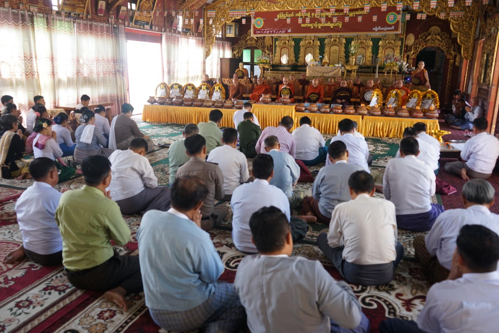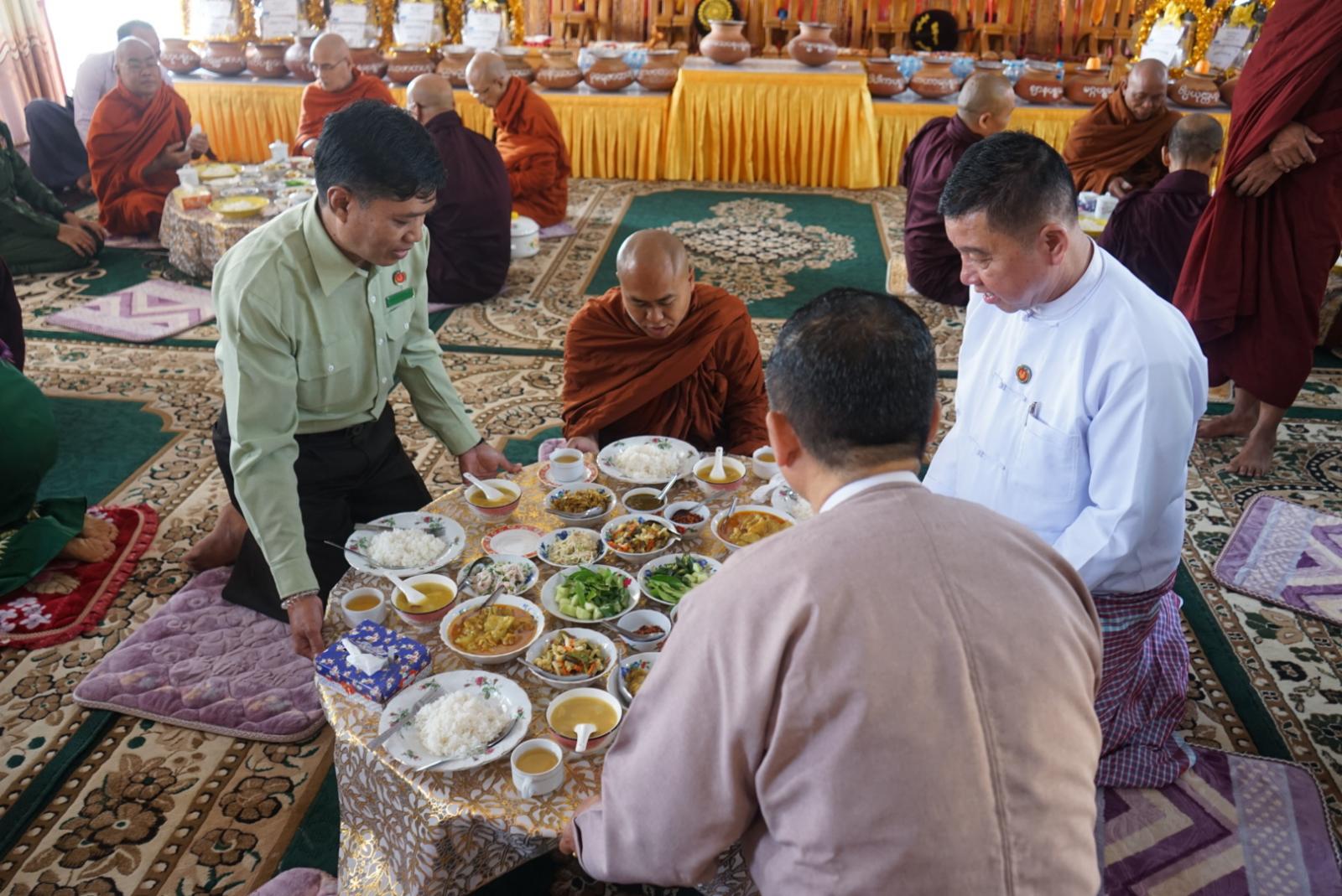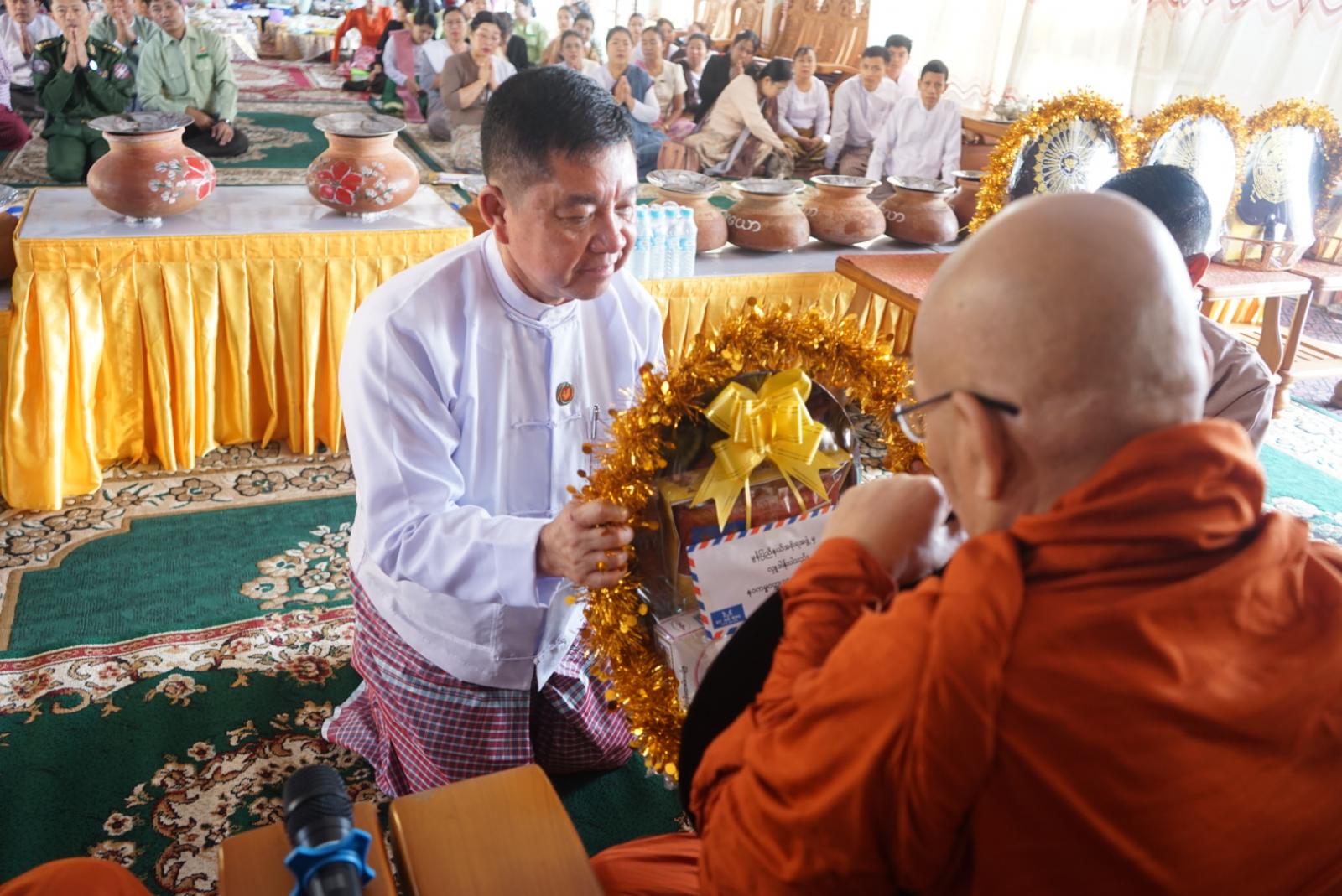 ထို့နောက် ဆရာတော်၊ သံဃာတော်အရှင်သူမြတ်များထံ ပြည်နယ်ဝန်ကြီးချုပ်၊ ပြည်နယ်တရား လွှတ်တော်တရားသူကြီးချုပ်နှင့် ပြည်နယ်ဝန်ကြီးများက လှူဖွယ်ဝတ္ထုပစ္စည်းများ ဆက်ကပ် လှူဒါန်းခဲ့ကြပြီး မော်လမြိုင်မြို့၊ လှိုင်ရပ်ကွက်၊ အတုလရန်အောင်ကျောင်းတိုက် (နိုင်ငံတော် သံဃမဟာနာယကအဖွဲ့) အဖွဲ့ဝင်ဆရာတော် ဘဒ္ဒန္တကောသလ္လ၊ (အဂ္ဂမဟာပဏ္ဍိတ)ထံမှ အနုမောဒနာတရား နာယူကြည်ညို၍ လှူဒါန်းမှုအစုစုတို့အတွက် ရေစက်သွန်းချအမျှ ပေးဝေခဲ့ကြကာ အခမ်းအနားကို “ဗုဒ္ဓသာသနံစိရံတိဋ္ဌတု သုံးကြိမ်ရွတ်ဆို ဆုတောင်းကာ ဆရာတော်သံဃာတော်များအား နေ့ဆွမ်းဆက်ကပ်လှူဒါန်းခဲ့ကြောင်း သိရသည်။