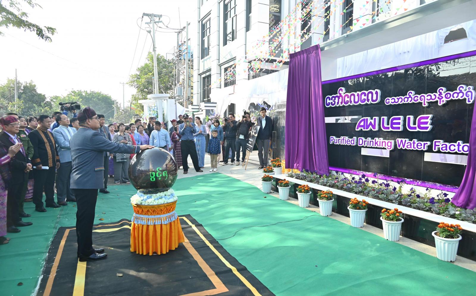 အဆိုပါ ရေသန့်စက်ရုံသစ်ဆိုင်းဘုတ်အား သိက္ခာတော်ရဆရာတော်က ကောင်းချီးတောင်းခံ ဆုတောင်းဆက်ကပ်၍ ပြည်နယ်တရားလွှတ်တော်တရားသူကြီးချုပ် ဒေါ်အေးအေးမော်၊ ပြည်နယ်လုံခြုံရေးနှင့် နယ်စပ်ရေးရာဝန်ကြီး ဗိုလ်မှူးကြီးကျော်သူရ၊ ပြည်နယ်သယံဇာတရေးရာဝန်ကြီး ဦးတိန့်ဆောင်တို့က သိက္ခာတော်ရဆရာများ၊ ဦးယွပ်ဇော်ခေါင်၊ ဦးလမိုင်ဂွမ်ဂျာတို့နှင့်အတူ ဖဲကြိုးဖြတ်ဖွင့်လှစ်ပေးကြပြီး ပြည်နယ်ဝန်ကြီးချုပ် ရေသန့်စက်ရုံသစ်ဆိုင်းဘုတ်ကို စက်ခလုတ်နှိပ်ဖွင့်လှစ်ပေးသည်။