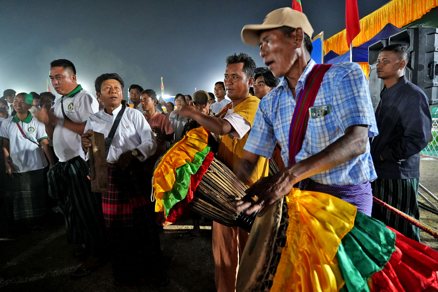 ဦးစွာ မကွေးတိုင်းဒေသကြီးအစိုးရအဖွဲ့ ဝန်ကြီးချုပ် ဦးတင့်လွင်နှင့် တာဝန်ရှိသူများသည် မြန်မာ့ရိုးရာထမနဲထိုးပြိုင်ပွဲ ဝင်ရောက်ယှဉ်ပြိုင်နေသည့် လုံခြုံရေးနှင့် နယ်စပ်ရေးရာဝန်ကြီးဌာနအောက်ရှိ ဌာနဆိုင်ရာ(၃)သင်း၊ စီးပွားရေးရာဝန်ကြီးဌာနအောက်ရှိ ဌာနဆိုင်ရာ(၁)သင်း၊ သယံဇာတရေးရာဝန်ကြီးဌာနအောက်ရှိ ဌာနဆိုင်ရာ(၂)သင်း၊ လူမှုရေးရာဝန်ကြီးဌာနအောက်ရှိ ဌာနဆိုင်ရာ (၃)သင်း၊ လမ်းပန်းဆက်သွယ်ရေးရာဝန်ကြီးဌာနအောက်ရှိ ဌာနဆိုင်ရာ(၃)သင်း၊ တိုင်းရင်းသားရေးရာ ဝန်ကြီးဌာနအောက်ရှိ ဌာနဆိုင်ရာများ၊ တိုင်းတရားလွှတ်တော်၊ တိုင်းဥပဒေချုပ်ရုံးတို့ ပူးပေါင်းပြီး အသင်း(၁)သင်းနှင့် အမှတ်(၈၈) ခြေမြန်တပ်မဌာနချုပ် ကိုယ်စားပြုအသင်း(၁)သင်း စုစုပေါင်း ပြိုင်ပွဲဝင်အသင်း(၁၄)သင်းတို့ ထမနဲထိုးယှဉ်ပြိုင်နေမှုနှင့် ပြိုင်ပွဲဝင်အသင်းများ ကိုယ်စားပြုအကအဖွဲ့များ ဖျော်ဖြေတင်ဆက်မှုကို ကြည့်ရှုအားပေးသည်။