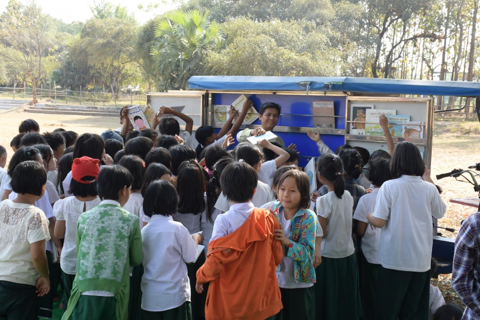 ပဲခူးတိုင်းဒေသကြီး၊ တောင်ငူခရိုင် ပြန်ကြားရေးနှင့်ပြည်သူ့ဆက်ဆံရေးဦးစီးဌာနသည် ကလေးငယ်များ အသိပညာဗဟုသုတရရှိစေရေးနှင့် ဉာဏ်ရည်ဖွံ့ဖြိုးတိုးတက်စေရေးအတွက် ရည်ရွယ်၍ ယမန်နေ့ မွန်းလွဲပိုင်းက တောင်ငူမြို့၊ အမှတ် (၅) အခြေခံပညာအထက်တန်းကျောင်းသို့ Mobile Library သုံးဘီးယာဥ်ဖြင့် ကွင်းဆင်းဆောင်ရွက်သည်။