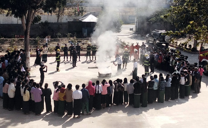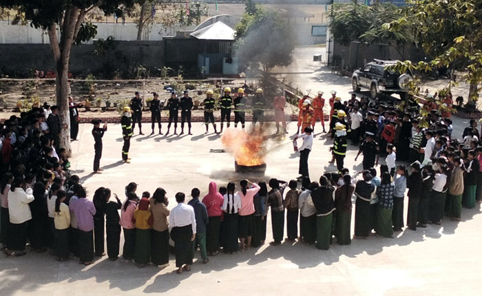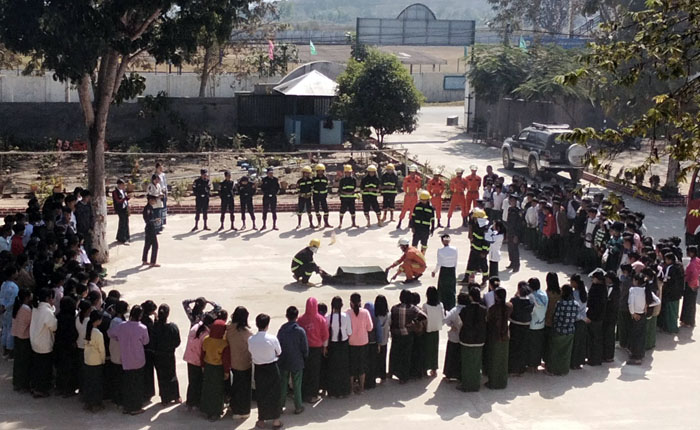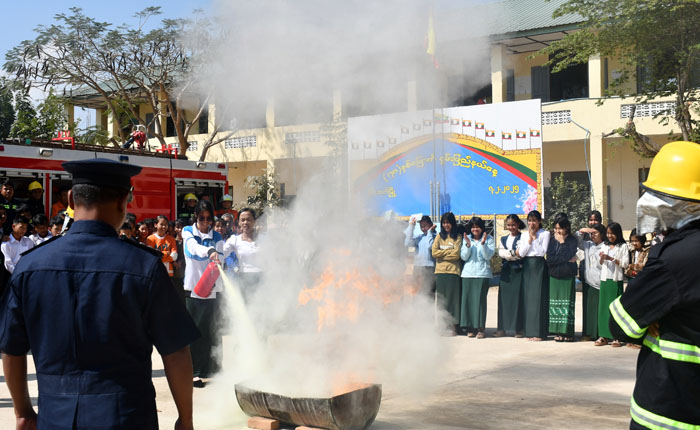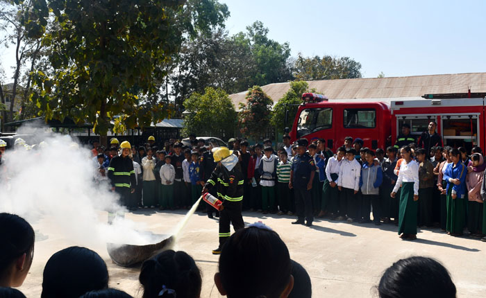ဦးစွာ ခရိုင်မီးသတ်ဦးစီးမှူး ဦးစိန်ခိုင်က မီးဘေးအန္တရာယ် အသိပညာပေး အကြောင်းအရာများ၊ မီးသတ်ဆေးဘူး ကိုင်သွယ်အသုံးပြုနည်းများကို ရှင်းလင်းဟောပြောပြီး ခရိုင်နှင့်မြို့နယ် မီးသတ်ဦးစီးဌာနမှ တပ်ဖွဲ့ဝင် (၂၃) ဦးက မီးသတ်ဆေးဘူးအသုံးပြု၍ မီးငြှိမ်းသတ်နည်းနှင့် ရေစိုအဝတ်ဖြင့် ဖုံးအုပ်၍ မီးငြှိမ်းသတ်နည်းတို့ကို လက်တွေ့သရုပ်ပြရာ ကျောင်းသား၊ ကျောင်းသူများကလည်း ပါဝင်ဆောင်ရွက်ခဲ့ကြကြောင်း သိရသည်။