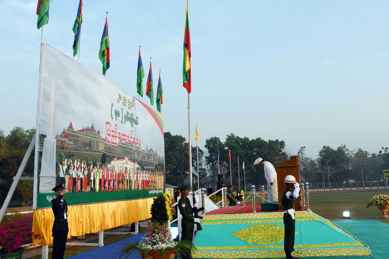 ဆက်လက်၍တိုင်းဒေသကြီးဝန်ကြီးချုပ်ဦးမြတ်ကိုက အလေးပြုခံစင်မြင့်တွင် နေရာယူပြီးဂုဏ်ပြုတပ်ဖွဲ့၏အလေးပြုခြင်းကိုခံယူကာ တက်ရောက်လာသောဧည့်သည်တော်များနှင့်အတူ ပြည်ထောင်စုသမ္မတမြန်မာနိုင်ငံတော်အလံကို အလေးပြုပြီးဂုဏ်ပြုတပ်ဖွဲ့တီးဝိုင်းက နိုင်ငံတော်သီချင်းကိုတီးမှုတ်၍ ကျဆုံးလေပြီးသော အာဇာနည်ခေါင်းဆောင်ကြီးများနှင့် တပ်မတော်သားများအား အလေးပြုကြသည်။