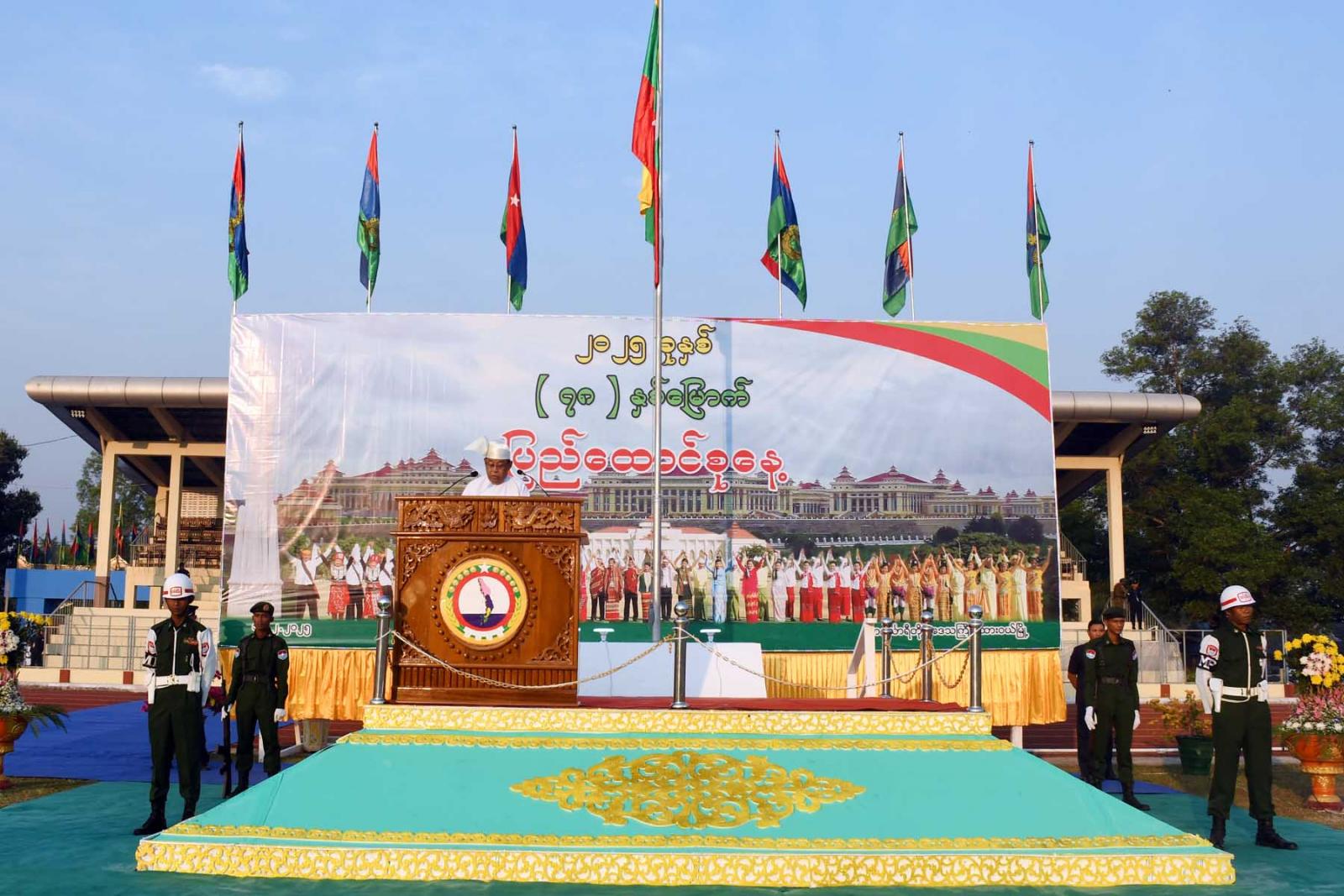 ရှေးဦးစွာ နံနက် ၅ နာရီ မိနစ် ၃၀ တွင် (၇၈)နှစ်မြောက် ပြည်ထောင်စုနေ့နိုင်ငံတော်အလံတင်အခမ်းအနားကိုကျင်းပရာ အလံတင်တပ်စုမှဦးဆောင်၍ တိုင်းဒေသကြီးလုံခြုံရေးနှင့်နယ်စပ်ရေးရာဝန်ကြီးဗိုလ်မှူးကြီးမင်းမင်းလတ်က နိုင်ငံတော်အလံကိုတိုင်ထိပ်သို့လွှင့်တင်ခဲ့ပြီး တက်ရောက်လာသောဧည့်သည်တော်များက နိုင်ငံတော်အလံအား အလေးပြုခဲ့ကြသည်။