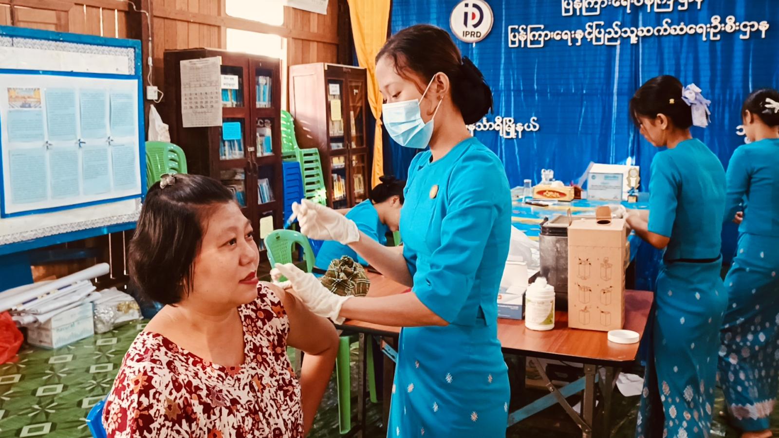 ထိုသို့ Pfizer ကိုဗစ်-၁၉ရောဂါကာကွယ်ဆေးထိုးနှံပေးရာတွင် ပြည်သူ့ကျန်းမာရေးဦးစီးဌာနမှ ကျန်းမာရေးမှူး-၄ ဒေါ်နှင်းထက်စိုးနှင့်ဝန်ထမ်းများက ကာကွယ်ဆေးထိုးရန်လာသူများကို ကာကွယ်ဆေး ထိုးစဉ် ဓါတ်မတည့်မှု ရှိ/မရှိ၊ အမည်နှင့်ကိုယ်ရေးအချက်အလက်များကို မေးမြန်းစာရင်းရေးသွင်းပြီး မှ Pfizer ကိုဗစ်-၁၉ရောဂါ ကာကွယ်ဆေးကို ထပ်ဆောင်းထိုးနှံပေးကြသည်။