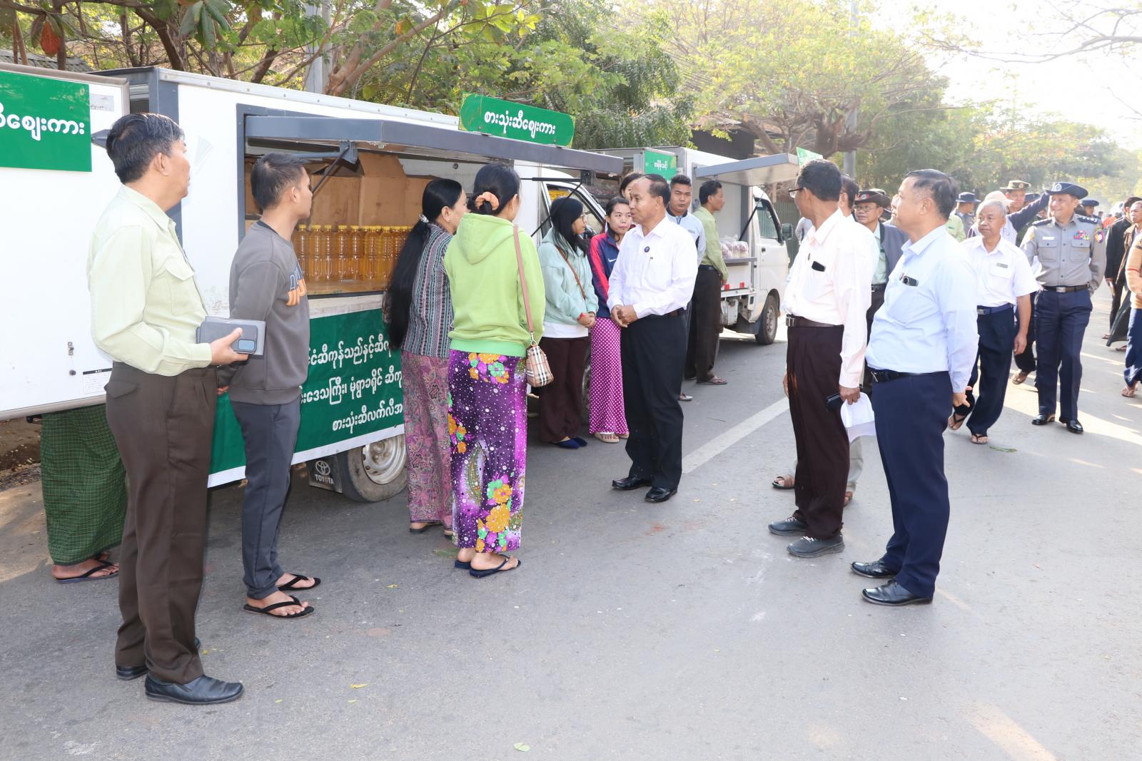 ဆက်လက်ပြီး တိုင်းဒေသကြီးဝန်ကြီးချုပ်နှင့် တာဝန်ရှိသူများသည် မုံရွာမြို့၊ လယ်တီရပ်ကွက်ရှိ ပြည်ထောင်စုဈေးကြီးသို့ ရောက်ရှိရာ မုံရွာမြို့အနီးဝန်းကျင်ရှိ ကျေးရွာများမှထွက်ရှိသည့် ဟင်းသီးဟင်းရွက်များနှင့် အသား၊ ငါးများ လက်လီလက်ကား ရောင်းဝယ်နေမှုများ အားလိုက်လံကြည့်ရှုခဲ့ကြပြီး ဈေးရောင်းချနေသူများအား ရင်းရင်းနှီးနှီးလိုက်လံမိတ်ဆက်စကားများ ပြောကြားခဲ့သည်။