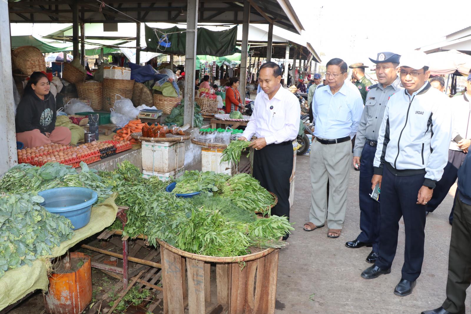 ထို့နောက်တိုင်းဒေသကြီးဝန်ကြီးချုပ်နှင့်တာဝန်ရှိသူများသည် ပြည်ထောင်စုကုန်စိမ်းပွဲရုံ ဈေးကြီးသို့ရောက်ရှိရာ ကုန်စိမ်းသီးနှံများရောင်းချနေမှု၊ ထုတ်ပိုးနေမှုများနှင့် သို လှောင်ထားရှိမှု များအား လိုက်လံကြည့်ရှုခဲ့ကြပြီး ပြည်ထောင်စုဈေးကြီးအတွင်း အမြဲသန့်ရှင်းသပ်ရပ်စေရေး၊ စွန့်ပစ်အမှိုက်များ စနစ်တကျစွန့်ပစ်ရေး၊ ဈေးကြီးသို့လာရောက်ကြသည့်မော်တော်ကားများနှင့် မော်တော်ဆိုင်ကယ်များ သတ်မှတ်နေရာတွင် ရပ်တန့်ထားရှိရေးနှင့် မီးဘေးအန္တရာယ် ကြိုတင်ကာကွယ်ရေးလုပ်ငန်းများ ဆောင်ရွက်သွားရေးတို့အား တာဝန်ရှိသူများအား မှာကြား ခဲ့ကြောင်း သိရသည်။