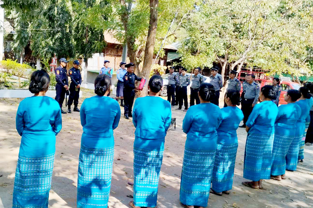 ထိုသို့ဆောင်ရွက်ရာတွင် မြို့နယ်ဦးစီးမှူး ဦးသန်းမြင့်က မြို့နယ်ရဲတပ်ဖွဲ့မှူး ရဲမှူးစိုးစိုးဦးဆောင်သည့် မြန်မာနိုင်ငံ ရဲတပ်ဖွဲ့ဝင်များနှင့် မိသားစုဝင်ရဲမေများအား မြို့မရဲစခန်း ဓမ္မာရုံတွင်တွေ့ဆုံ၍ မီးဘေး ကြိုတင်ကာကွယ်ရေးဆိုင်ရာများကို အသိပညာပေး ဆွေးနွေးပြီး၊ ဓမ္မာရုံရှေ့ မြေကွက်လပ်တွင် ဆီမီးလောင်မှုအား အလွယ်တကူ ငြှိမ်းသတ်နည်း၊ မီးသတ်ဆေးဗူး အသုံးပြုနည်းနှင့် မီးသတ်ဆေးဗူးနှင့် မီးငြှိမ်းသတ်နည်းများကို သင်ကြားပြသ၍ ရဲတပ်ဖွဲ့ဝင်များ၊ မိသားစုဝင်ရဲမေများအား၊ လက်တွေ့ပါဝင် လုပ်ဆောင်စေကာ၊ ဇာတ်တိုက်လေ့ကျင့်ခြင်းများကို ဆောင်ရွက်ခဲ့ကြသည်။ ယင်းနောက်မီးသတ် ဦးစီးမှူးနှင့် အဖွဲ့ဝင်များသည် မြို့မရဲစခန်းမှူးနှင့် တာဝန်ရှိသူများလိုက်ပါလျက်၊ အချုပ်ခန်းနှင့် ရုံးအဆောက်အဦများနှင့် အိမ်ထောင်သည်လိုင်းခန်းများတွင် မီးသုံးစွဲနေမှုနှင့် မီးဘေးကြိုတင်ကာကွယ်ရေး ဆောင်ရွက်ထားရှိမှု အခြေအနေများကို လှည့်လည်စစ်ဆေးကာ လိုအပ်သည်များကို အကြံပြုဆွေးနွေးခဲ့ ကြကြောင်း သိရသည်။