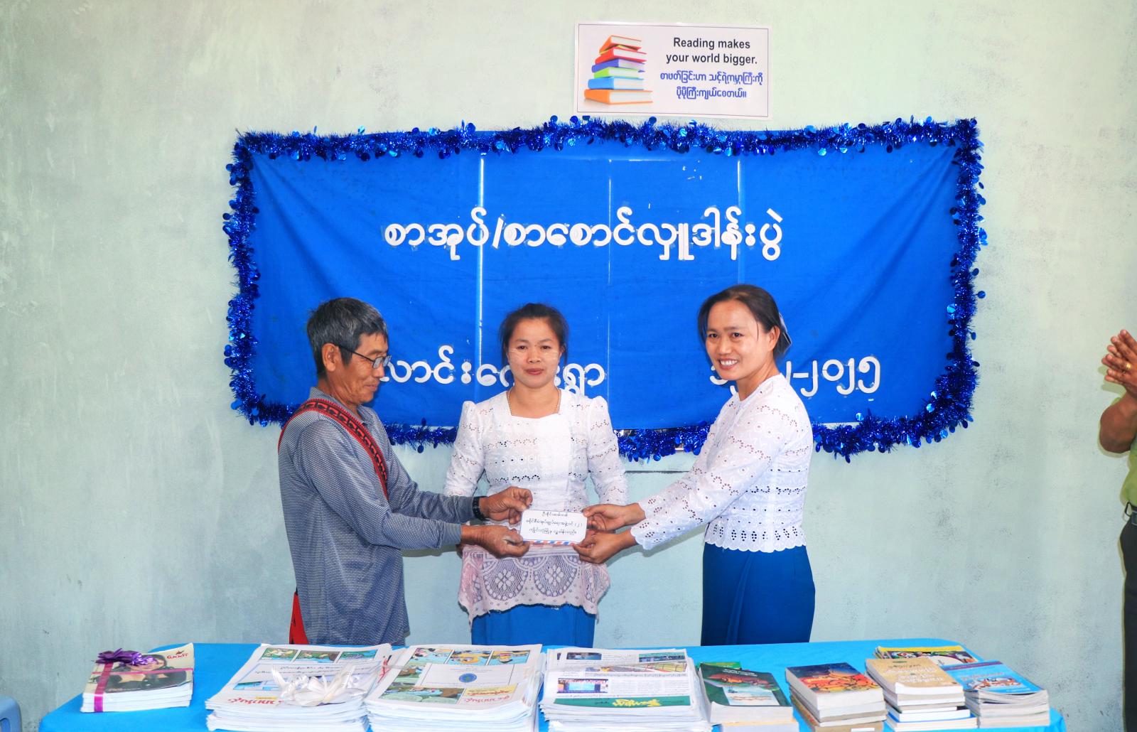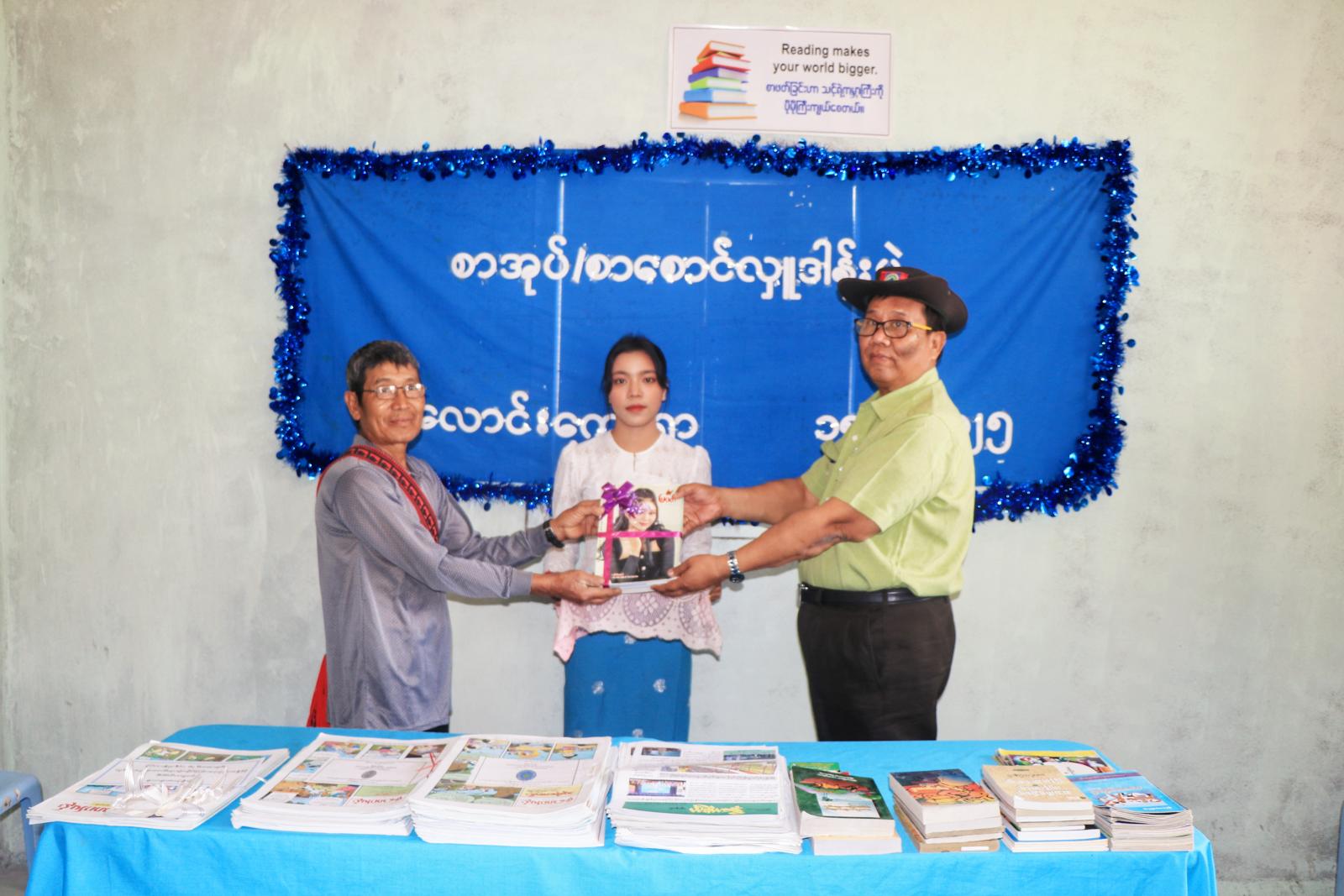 ဆက်လက်၍ ရှင်သန်ခြင်းစာကြည့်တိုက်အတွက် မြို့နယ်စီမံအုပ်ချုပ်ရေးအဖွဲ့ဥက္ကဋ္ဌနှင့် အလှူရှင်မျာက သုတ၊ ရသ စာအုပ်၊ စာစောင်းများကို ပေးအပ်လှူဒါန်းရာ အုပ်ချုပ်ရေးမှူး ဦးဧရိယာက လက်ခံရယူခဲ့သည်။