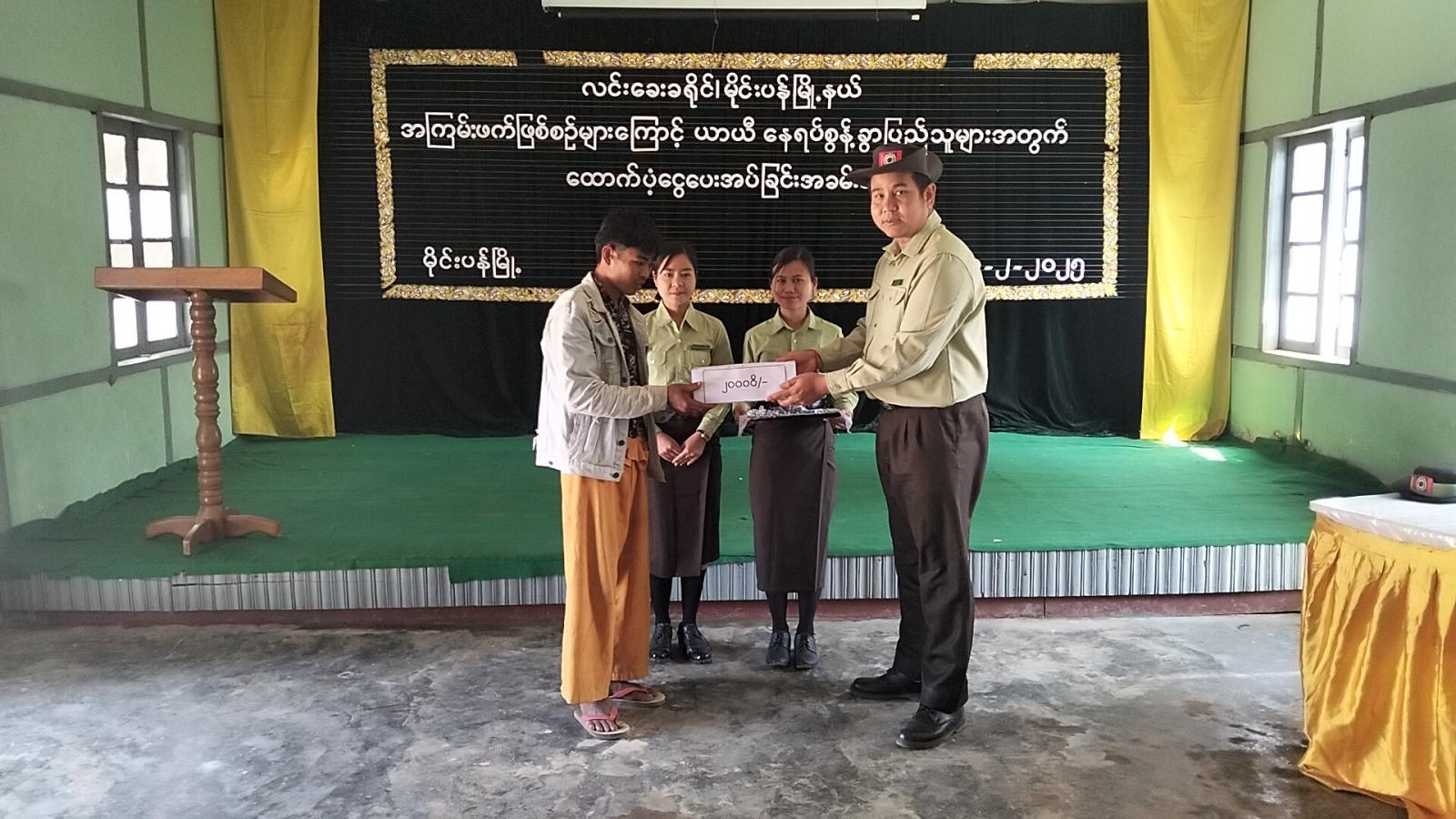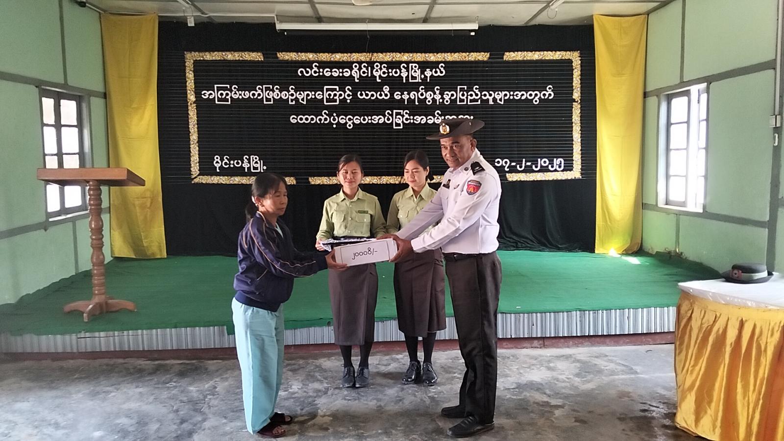 ရှမ်းပြည်နယ်(တောင်ပိုင်း)၊ လင်းခေးခရိုင်၊ မိုင်းပန်မြို့နယ်အတွင်းရှိ အကြမ်းဖက်ဖြစ်စဉ်များကြောင့် ယာယီနေရပ်စွန့်ခွာပြည်သူများအတွက် အမျိုးသားသဘာဝဘေးအန္တရာယ်စီမံခန့်ခွဲမှု ရန်ပုံငွေဖြင့် ထောက်ပံ့ငွေပေးအပ်ပွဲအခမ်းအနားကို မြို့နယ်အထွေထွေအုပ်ချုပ်ရေးဦးစီးဌာန၊ နမ့်ပန်ခန်းမ၌ ယနေ့နံနက် ၁၁ နာရီက ကျင်းပခဲ့သည်။