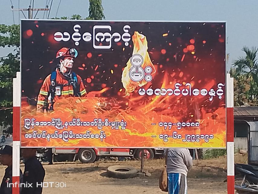 ဧရာဝတီတိုင်းဒေသကြီး၊ မြန်အောင်ခရိုင်၊ မြန်အောင်မြို့နယ် အင်ပင်မြို့ အမှတ်(၁) ရပ်ကွက် ကြံခင်း-မြန်အောင်-ဟင်္သာတလမ်းမကြီးနှင့် အင်ပင်မြို့မလမ်းဒေါင့်တွင် ယမန်နေ့ နံနက်က "သင့်ကြောင့်မီးမလောင်ပါစေနှင့်" မီးဘေးအန္တရာယ် ကြိုတင်ကာကွယ်ရေး သတိပေး ဆိုင်းဘုတ် ပိုစတာစိုက်ထူပွဲ ကျင်းပခဲ့ကြောင်း သိရသည်။