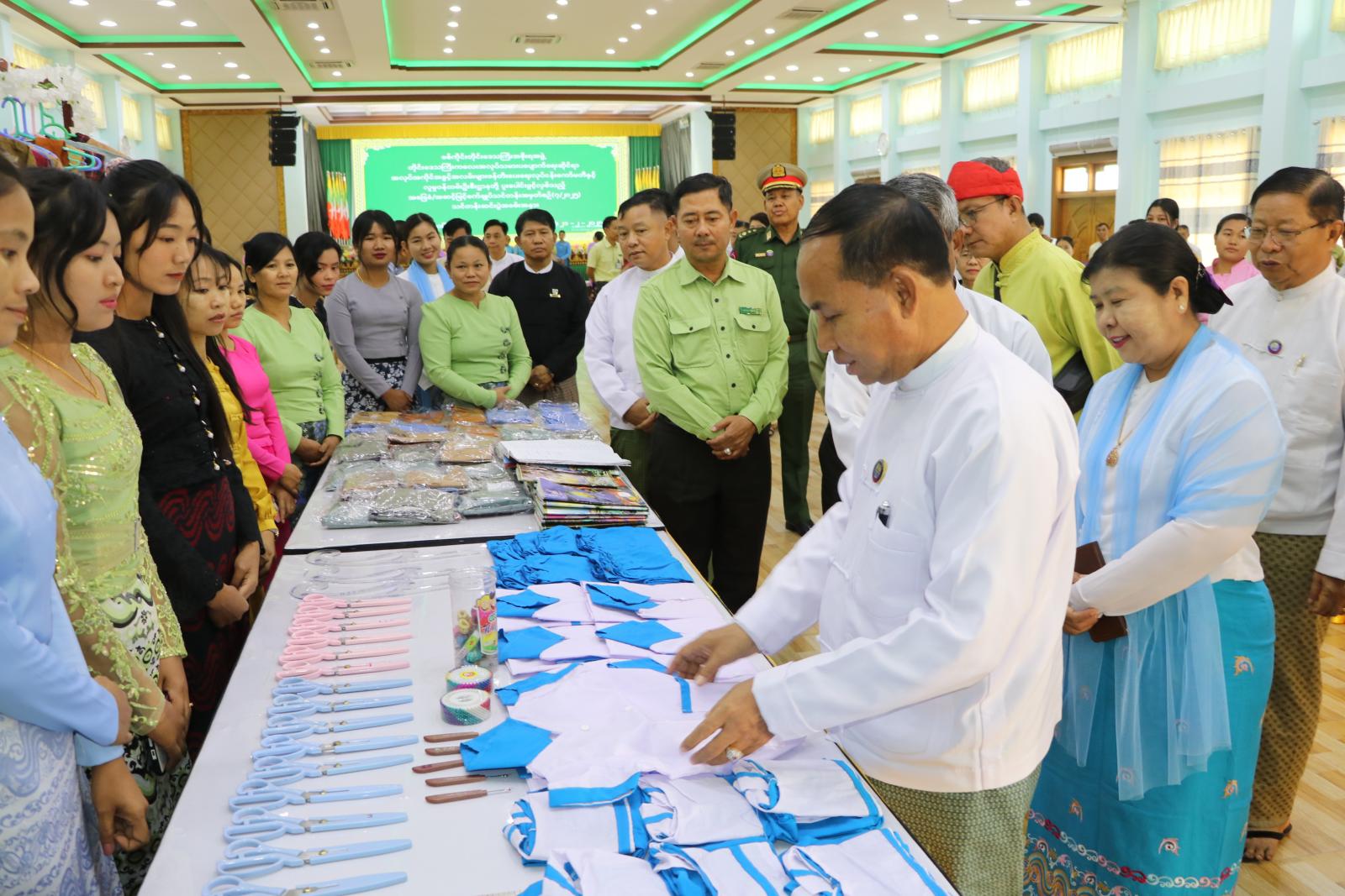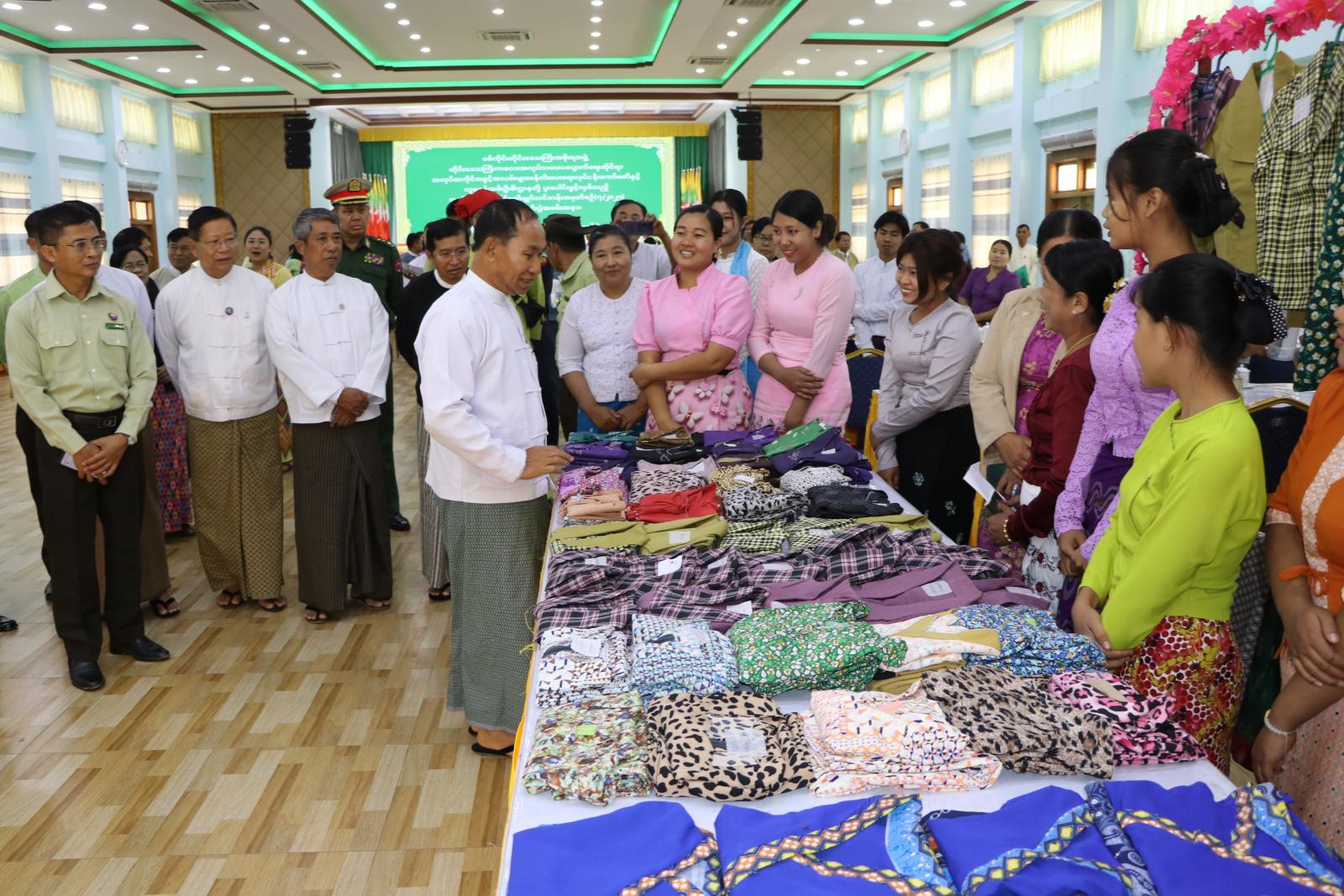 ထို့နောက် တိုင်းဒေသကြီးဝန်ကြီးချုပ်နှင့် တာဝန်ရှိသူများက ခန်းမအတွင်း ခင်းကျင်းပြသထားသည့် သင်တန်းသူများကိုယ်တိုင် ချုပ်လုပ်ထားသည့် အဝတ်အထည်များနှင့် သင်ထောက်ကူပစ္စည်းများအား လိုက်လံကြည့်ရှုအားပေးခဲ့ကြပြီး လိုအပ်သည်များကို တာဝန်ရှိသူများနှင့် ဖြည့်ဆည်းပေါင်းစပ် ဆောင်ရွက်ပေးခဲ့ကြောင်း သိရသည်။