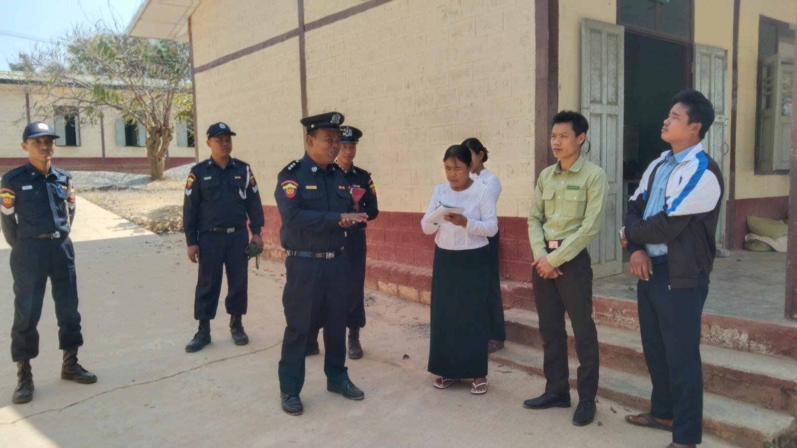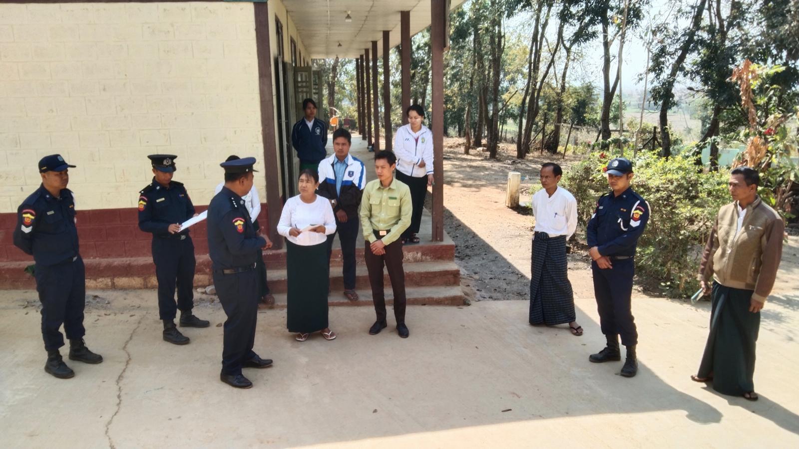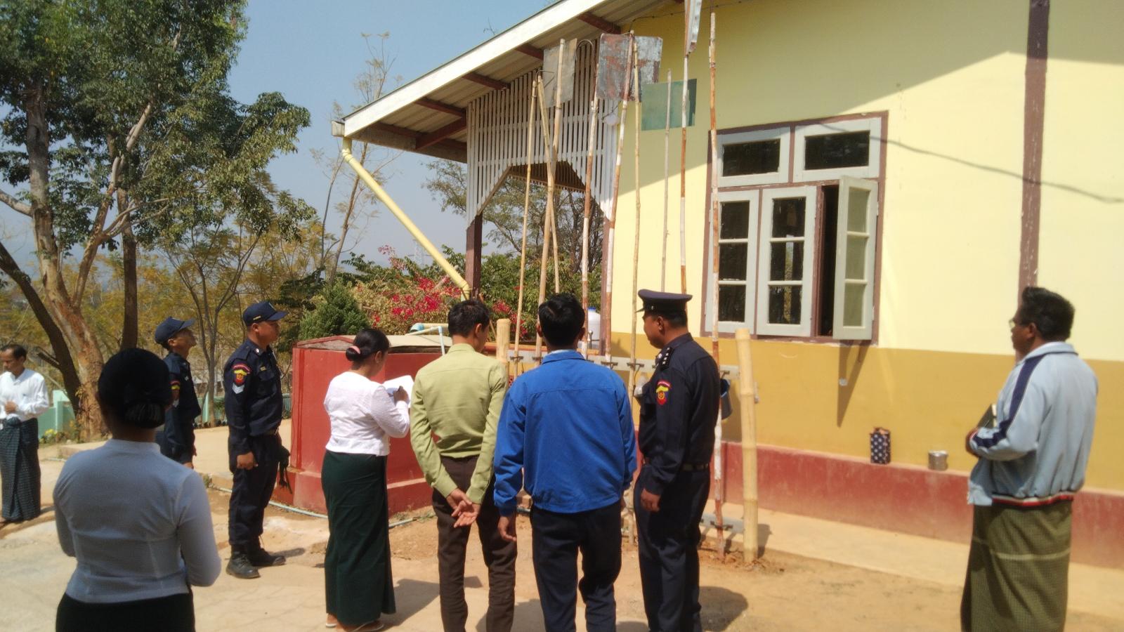 ထိုသို့ဆောင်ရွက်ရာတွင် မြို့နယ်မီးသတ်ဦးစီးဌာနမှ မြို့နယ်ဦးစီးမှူး ဦးကျော်မိုးနိုင်၊ မြို့နယ်လျှပ်စစ်အင်ဂျင်နီယာရုံးမှ တာဝန်ခံအင်ဂျင်နီယာ ဦးအောင်ဇင်ဦး၊ မြို့နယ်ပညာရေးမှူး ဦးဝင်းညွန့်၊ ဒုတိယမြို့နယ်ပညာရေးမှူး ဦးခွန်ကျော်နောင်နှင့် တာဝန်ရှိသူများက စက်မှု၊ စိုက်ပျိုး၊ မွေးမြူရေး အထက်တန်းကျောင်း (ပေါင်လင်း)ရှိ စာသင်ခန်းများ၌ မီးဘေးလုံခြုံရေးအတွက် လျှပ်စစ်မီးသုံးစွဲမှုနှင့် လျှပ်စစ်သွယ်တန်းမှုအခြေအနေ၊ မီးသတ်ဆေးဘူးနှင့် မီးသတ်ပစ္စည်း ကိရိယာများ ထားရှိမှုအခြေအနေ၊ မီးဘေးအန္တရာယ်ကြိုတင်ကာကွယ်ရန်အတွက်ရေလုံလောက်စွာ ရရှိမှုအခြေအနေ၊ မီးချိပ်၊ မီးကပ်၊ ရေပုံး၊ သဲပုံးများ စနစ်တကျထားရှိမှု အခြေအနေများနှင့် ကျောင်းအတွင်းသို့ မီးသတ်ကားများအလွယ်တကူ ဝင်ရောက်နိုင်မှု ရှိ/မရှိ စသည့်အခြေအနေများ အား ကြည့်ရှုစစ်ဆေးသည်။