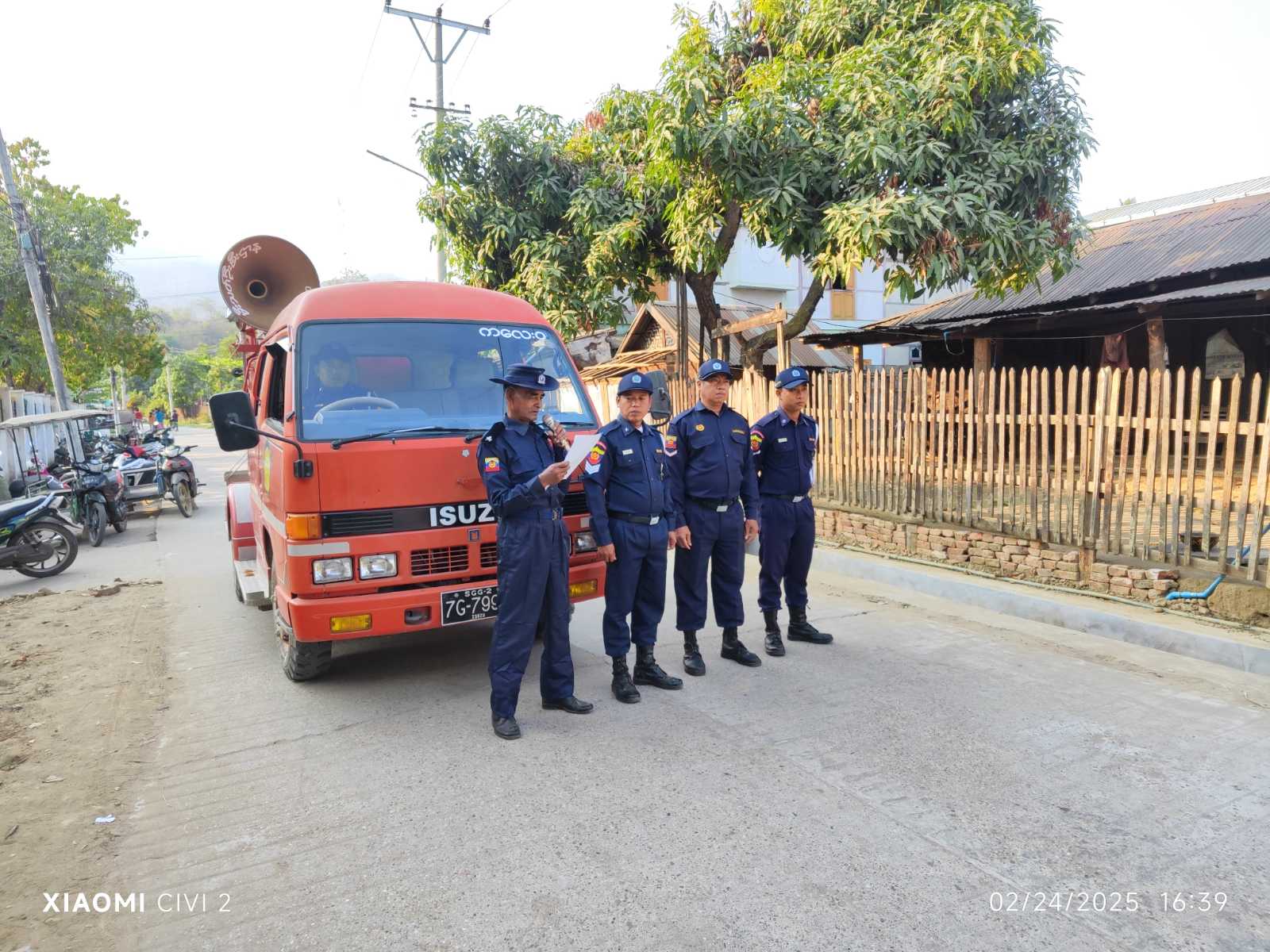 မြို့နယ်မီးသတ်ဦးစီးဌာန ဦးစီးအရာရှိ ဦးမျိုးသိင်္ခ ဦးဆောင်သော မီးသတ်တပ်ဖွဲ့ဝင်များက ပွင့်လင်းရာသီသို့ ရောက်ရှိလာပြီးဖြစ်သဖြင့် မြို့နယ်အတွင်း မီးလောင်မှုမီးလန့်မှုများ မဖြစ်ပွားမပေါ်ပေါက်စေရေးအတွက် ရပ်ကွက်နေပြည်သူများအား မီးချိတ်၊ မီးကတ်၊ လှေကား၊ ရေ၊ သဲ၊ မီးသတ်ဆေးဘူးများ အိမ်တိုင်းဆောင်ထားရန် မီးကိုသတ်မှတ်အချိန်အတွင်း သတိပြုသုံးစွဲရန် လေပြင်းတိုက်ခတ်ချိန်အတွင်း မီးငြှိမ်းသတ်ထားကြရန် မြို့တွင်းလှည့်လည်၍ အသိပေးနှိုးဆော်ခဲ့ကြောင်း သိရသည်။
