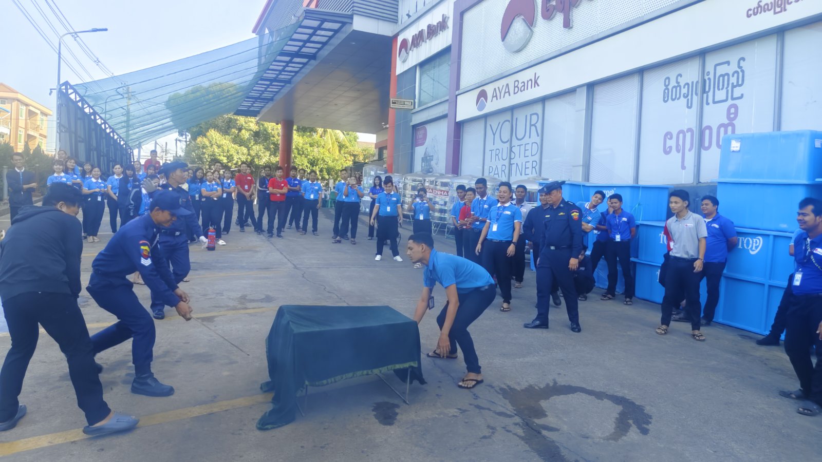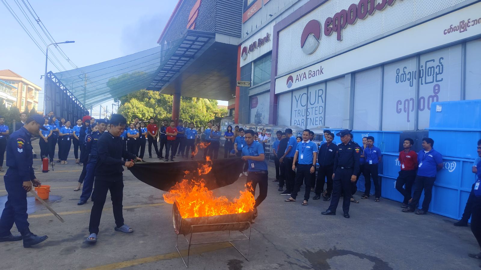 ထို့နောက် မော်လမြိုင်မြို့နယ်မီးသတ်ဦးစီးဌာနမှ သန္ဓေမီးသတ်တပ်ဖွဲ့ဝင်များနှင့် အရန်မီးသတ်တပ်ဖွဲ့ဝင်များက မီးသတ်ဆေးဘူးအသုံးပြု၍ မီးငြှိမ်းသတ်နည်း၊ ရေစိုအဝတ်ဖြင့် ဖုံးအုပ်ငြှိမ်းသတ်နည်းနှင့် မီးသတ်ယာဉ်များဖြင့် မီးငြှိမ်းသတ်နည်းများကို လက်တွေ့သရုပ်ပြလေ့ကျင့်ပေးရာ PRO 1 အိမ်ဆောက်ပစ္စည်းအရောင်းဆိုင်ရှိ ဝန်ထမ်းများက စိတ်ပါဝင်စားစွာ ပူးပေါင်းပါဝင်ဆောင်ရွက်ခဲ့ကြကြောင်း သိရှိရသည်။