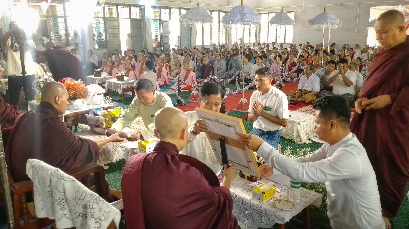 ထို့နောက် ဆရာတော်ကြီးများ၊ စာအောင်သံဃာများနှင့် ပင့်သံဃာများအား ဧည့်ပရိသတ်အပေါင်းတို့က ဆွမ်းဆန်တော်နှင့် လှူဖွယ်ဝတ္ထုပစ္စည်းများ စုစုပေါင်းတန်ဖိုးငွေကျပ် သိန်း (၆၃၀) ခန့်အား ဆက်ကပ်လောင်းလှူခဲ့ကြကြောင်း သိရသည်။