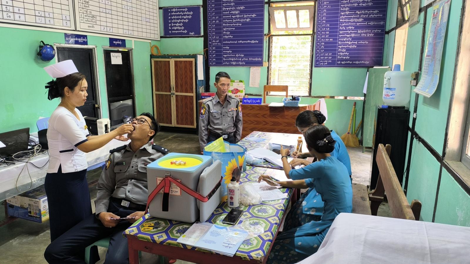 တိုက်ကျွေးရာတွင် မြို့နယ်ပြည်သူ့ကျန်းမာရေးဦးစီးဌာနမှူး ဒေါက်တာရဲမင်းဦး လမ်းညွှန်မှုဖြင့် ကျန်းမာရေးဝန်ထမ်းများက မြို့နယ်အတွင်းရှိ ဌာနဆိုင်ရာဝန်ထမ်းများနှင့် မိသားစုဝင်များအား ပြင်းထန် ဝမ်းပျက်ဝမ်းလျှောရောဂါ ကာကွယ်ဆေး (Oral Cholera Vaccine – OCV ) ကို သက်ဆိုင်ရာ ရုံးများ၌ တိုက်ကျွေးလျက်ရှိသည်။