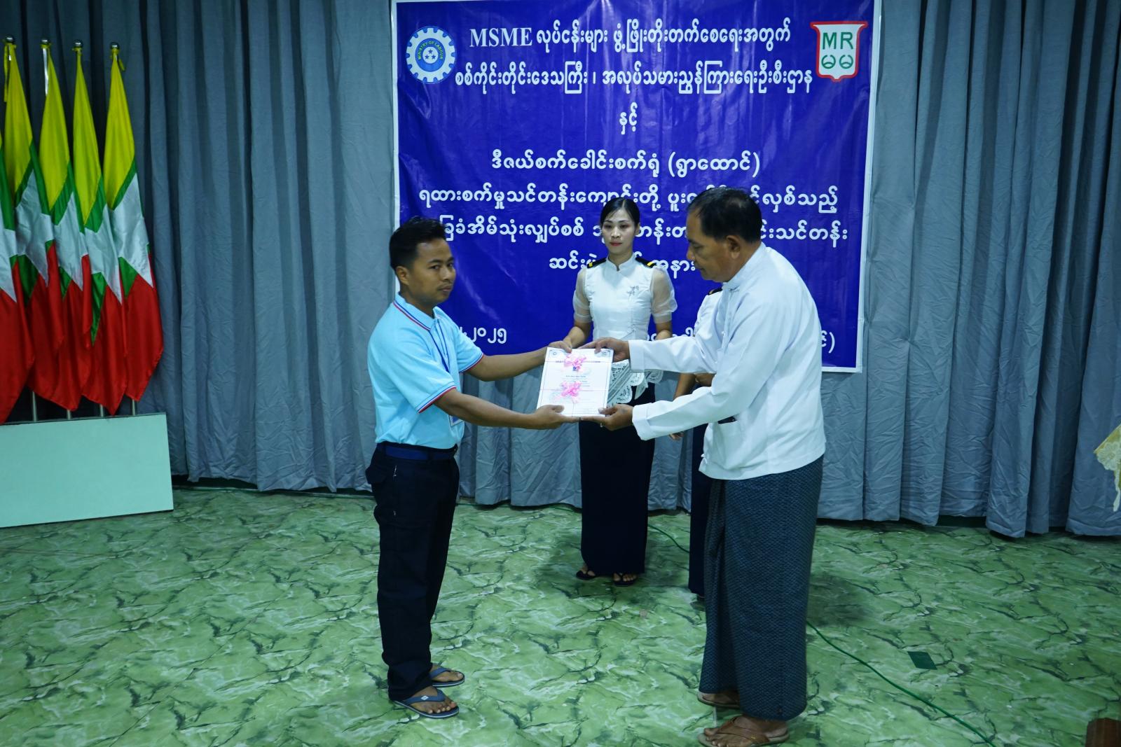အခမ်းအနားတွင် ခရိုင်စီမံအုပ်ချုပ်ရေးအဖွဲ့ဥက္ကဋ္ဌ ဦးမျိုးအောင်က သင်တန်းဆင်းအမှာစကား ပြောကြားခဲ့ပြီး ဒီဇယ်စက်ခေါင်းစက်ရုံ(ရွာထောင်) အထွေထွေမန်နေဂျာ ဦးအောင်ကျော်နိုင်က သင်တန်းဖွင့်လှစ်ရခြင်းနှင့်ပတ်သက်၍ အိမ်တွင်းလျှပ်စစ်သွယ်တန်းတပ်ဆင်ခြင်း သင်တန်းကို ဒေသအတွက် အကျိုးရှိစေရန် ရည်ရွယ်၍ ဖွင့်လှစ်ရခြင်းဖြစ်ကြောင်း၊ MSME လုပ်ငန်းများဖွံ့ဖြိုးတိုးတက်ရေး အတွက် လျှပ်စစ်ကဏ္ဍမှာ မရှိမဖြစ်လိုအပ်သလို ကျွမ်းကျင်လုပ်သားများ မွေးထုတ်ပေးရန်လည်း လိုအပ်သည့်အတွက်ဖွင့်လှစ်ရခြင်းဖြစ်ပါကြောင်း၊ ယခုသင်တန်းမှ သင်ကြားပေးလိုက်သော နည်းပညာများဖြင့် လက်တွေ့နယ်ပယ်တွင် အသုံးချပြီး MSME လုပ်ငန်းများဖွံ့ဖြိုးတိုးတက်ရေးအတွက် မိမိတို့ကျရာကဏ္ဍမှ ပူးပေါင်းပါဝင်ပေးကြစေလိုကြောင်းဖြင့် ပြောကြားခဲ့ကာ အလုပ်သမားညွှန်ကြားရေးဦးစီးဌာန၊ ဦးစီး အရာရှိ၊ ဦးသန်းထွန်းအောင်မှ သင်တန်းဆင်းလက်မှတ်များ ပေးအပ်ခဲ့သည်။