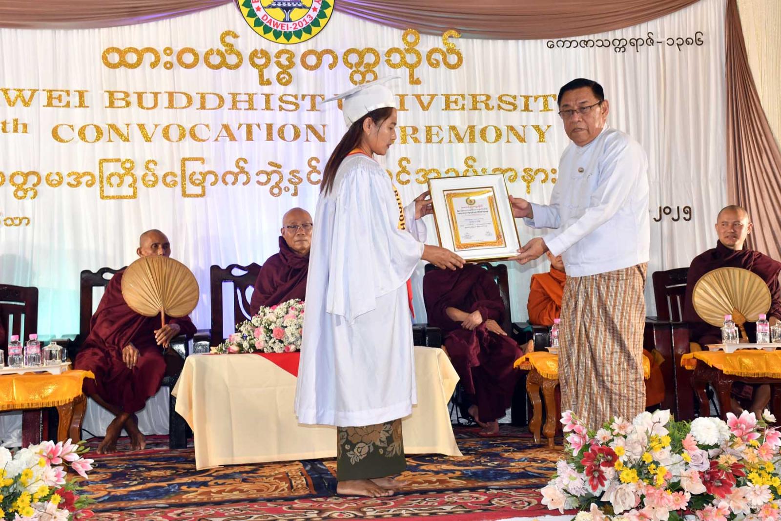 ပြည်တွင်း၊ ပြည်ပသာသနာပြုပညာရှင်များ မွေးထုတ်နိုင်ရေးအတွက် နိုင်ငံတော်သံဃမဟာနာယကဥက္ကဋ္ဌ ဗန်းမော်ဆရာတော်ဘုရားကြီးနှင့် ဆရာကြီးဦးမြင့်ဆွေ(မဟာဝိဇ္ဇာ-လန်ဒန်)တို့ တည်ထောင်ဖွင့်လှစ်ထားသော ထားဝယ်ဗုဒ္ဓတက္ကသိုလ်၏ သတ္တမအကြိမ်မြောက် ဘွဲ့နှင်းသဘင်အခမ်းအနားကို ယမန်နေ့ မွန်းလွဲ ၂ နာရီက တနင်္သာရီတိုင်းဒေသကြီး၊ ထားဝယ်မြို့၊ မြို့မယဉ်ငေးသာသနာ့ရိပ်သာ၌ ကျင်းပရာရှေးဦးစွာ တိုင်းဒေသကြီးဝန်ကြီးချုပ် ဦးမြတ်ကိုက ဗုဒ္ဓရုပ်ပွားတော်မြတ်အား ဆီးမီးထွန်းညှိပူဇော်သည်။