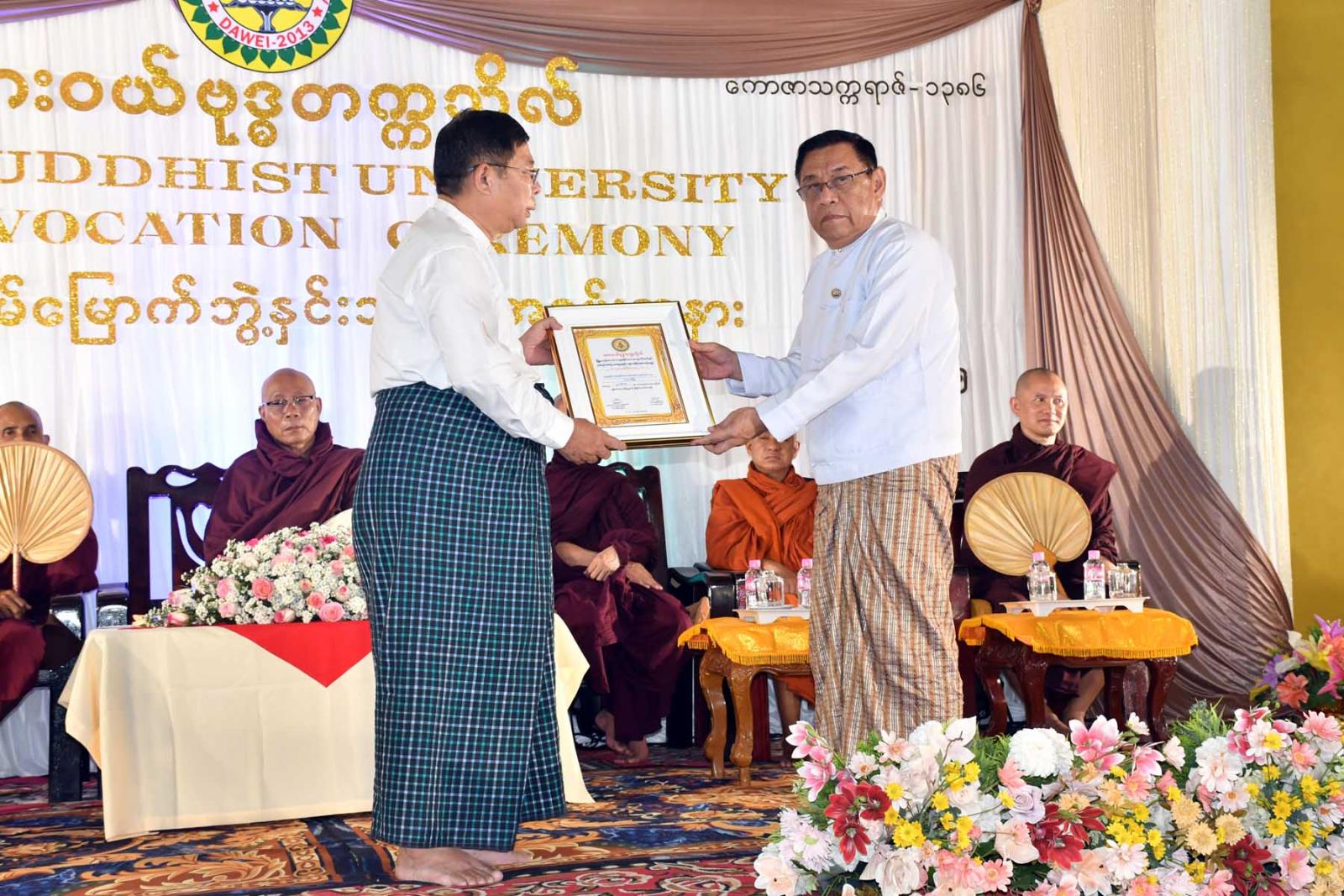 ထို့နောက် ဒုတိယပါမောက္ခချုပ်(စီမံ) ဆရာဦးအောင်ဇော်နိုင်က ထားဝယ်ဗုဒ္ဓတက္ကသိုလ်ဖွင့်လှစ်ခြင်းနှင့် ပညာရေးဆိုင်ရာအကြောင်းအရာများကို တင်ပြလျှောက်ထားပြီး ထားဝယ်ဗုဒ္ဓတက္ကသိုလ်ပါမောက္ခချုပ်ဆရာတော်မြိုမယဉ်ငေးသာသနာ့ ရိပ်သာပဓာနနာယကဆရာတော်ဘဒ္ဒန္တဣန္ဒဉာဏ (သဒ္ဓမ္မဇောတိကဓဇ၊ မဟာကမ္မဋ္ဌာနာစရိယထံက ဩဝါဒကထာမိန့်ကြားကာ B.A ဘွဲ့များ၊ Diploma Basic၊ Diploma (PA.B.E)ဘွဲ့များ လက်ခံယူကြမည့် ကျောင်းသား/ကျောင်းသူများ၏ ဘွဲ့ခံစာရင်းကို အတည်ပြုလက်မှတ်ရေးထိုးသည်။