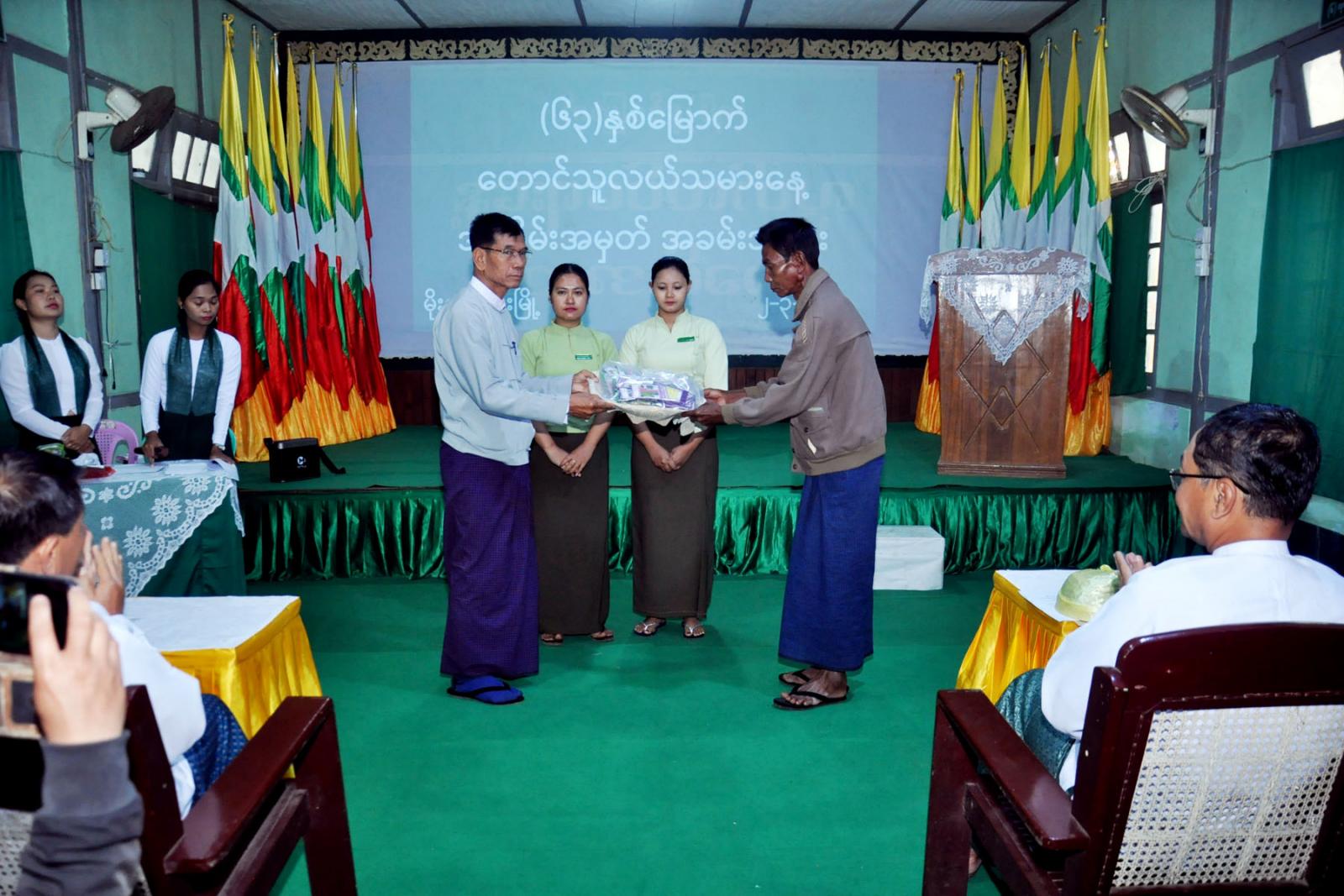 ထို့နောက် မြို့နယ်စီမံအုပ်ချုပ်ရေးအဖွဲ့ဥက္ကဋ္ဌနှင့်အဖွဲ့ဝင်များက မြို့နယ်အတွင်း ကြိုးစားစိုက်ပျိုးထုတ်လုပ်သည့် တောင်သူများအား ဟင်းသီးဟင်းရွက်သစ်သီးဝလံ၊ ပန်းမန်မျိုးစေ့နှင့်ရွက်ဖျန်းမြေဩဇာများ ချီးမြှင့်ထောက်ပံ့ပေးအပ်ခဲ့သည်။