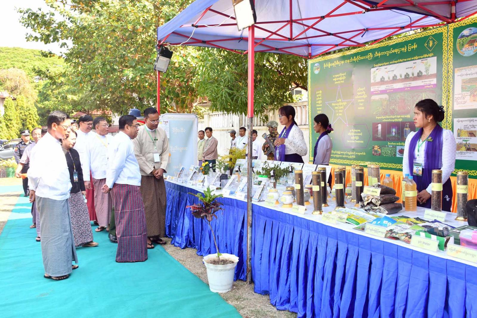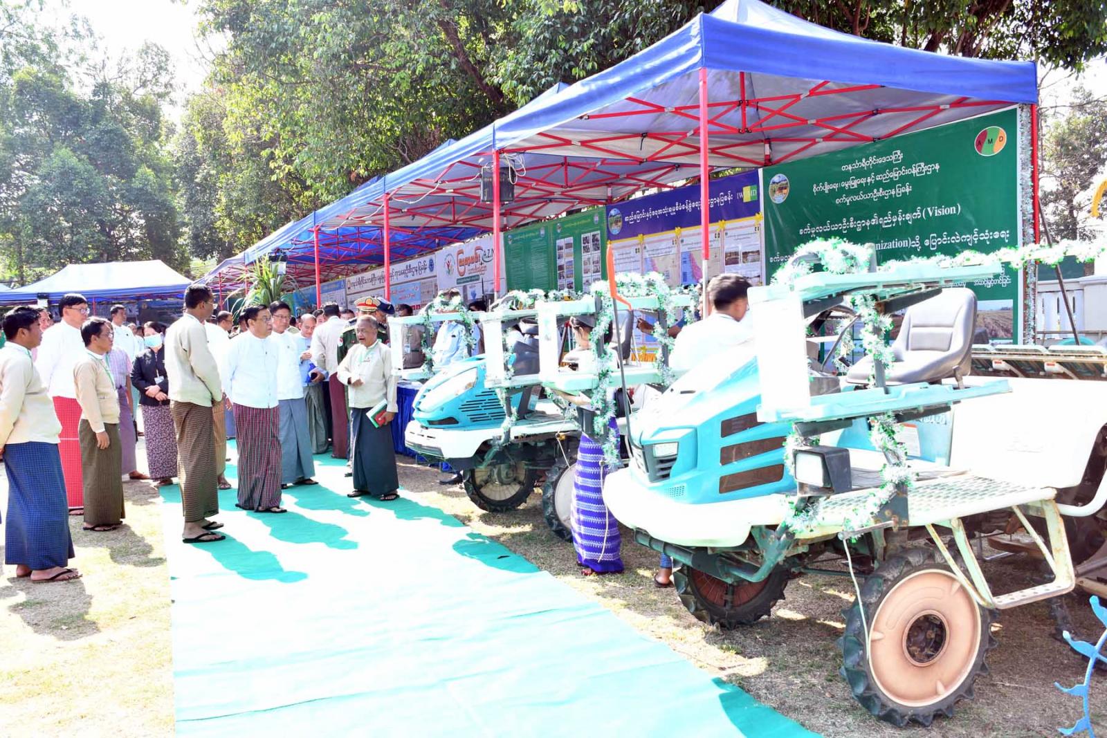 ဆက်လက်၍ တိုင်းဒေသကြီးဝန်ကြီးချုပ် ဦးမြတ်ကိုနှင့်တာဝန်ရှိသူများ၊ အကျိုးဆောင်တောင်သူများတို့က ခင်းကျင်းပြသထားသည့် ဌာနအလိုက်လုပ်ငန်းဆောင်ရွက်မှု၊ တိုင်းဒေသကြီးအတွင်းမှ ထွက်ရှိသောဒေသထွက်ကုန်များ၊ ဒေသမှထွက်ရှိသော MSME ပြခန်းများ၊ သစ်သီးဝလံများ၊ ဒေသထွက်သစ်သားလက်မှုပစ္စည်းများ၊ တန်းဖိုးမြှင့်ရေရှည် စားသောက်ကုန်ပစ္စည်များ၊ စိုက်ပျိုးရေးမွေးမြူရေး၊ မျိုးစေ့၊ သွင်အားစုနှင့်ဒေသထွက်ကုန်အရောင်းပြခန်း၊ စိုက်ပျိုးရေးကဏ္ဍဖွံ့ဖြိုးတိုးတက်စေရေး တောင်သူလယ်သမားများအတွက် တန်ဖိုးသင့်ကောက်စိုက်စက်များစသည့် ပြခန်း(၁၈)ခန်းအား စိတ်ပါဝင်စားစွာလှည့်လည်ကြည့်ရှုအားပေးပြီး တိုင်းဒေသကြီးဝန်ကြီးချုပ်က တောင်သူများအား ရင်းရင်းနှီးနှီးလိုက်လံနှုတ်ဆက်ကြောင်း သတင်းရရှိသည်။