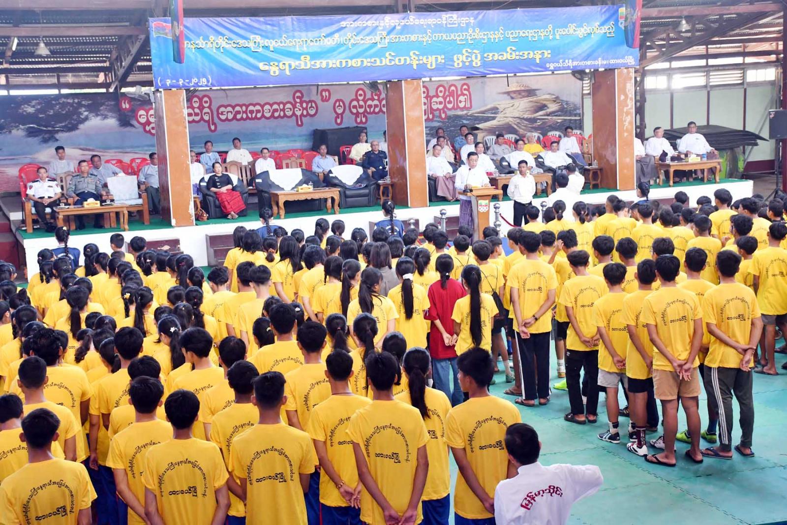 အခမ်းအနားတွင်တိုင်းဒေသကြီးဝန်ကြီးချုပ် ဦးမြတ်ကိုက တစ်မျိုးသားလုံးကျန်းမာသန်စွမ်းပြီး ကိုယ်လက်ကြံ့ခိုင်ရေးအတွက် အားကစားနှင့် ကာယပညာဖြင့် အကောင်ထည်ဖော် ဆောင်ရွက်လျက်ရှိသလို နိုင်ငံတော်က ချမှတ်ပေးထားသော အားကစားနှင့်ကာယပညာဆိုင်ရာ မူဝါဒများနှင့်အညီ အားကစားလုပ်ငန်းများကို တစ်မျိုးသားလုံးလူထုလှုပ်ရှားမှုအသွင်ဖြင့် ဆောင်ရွက်လျက်ရှိကြောင်း၊ လူငယ်လူရွယ်များ ဗလငါးတန်ဖွံ့ဖြိုးတိုးတက်ပြီး အားကစားအသိစိတ်ဓာတ် ပိုမိုအသက်ဝင်ယုံကြည်လာခြင်းမှသည်တ စ်မျိုးသားလုံး၏ ကာယ၊ ဉာဏ၊ စာရိတ္တဘက်စုံဖွံ့ဖြိုးတိုးတက်လာစေရန်၊ မိမိဝါသနာပါသော အားကစားနည်းများကို လေ့ကျင့်လိုက်စားခြင်းဖြင့် အမျိုးသားအားကစားအဆင့်အတန်းတိုးတက်မြင့်မားလာစေရန်၊ နွေရာသီသင်တန်းများမှတစ်ဆင့် မျိုးဆက်သစ်အားကစားသမားများ ပေါ်ထွက်လာစေရန်၊ လူငယ်လူရွယ်များအချင်းချင်း ချစ်ကြည်ရင်းနှီးမှုနှင့်စည်းလုံးညီညွှတ်မှု ပိုမိုခိုင်မြဲလာစေရန်၊ စည်းကမ်းကောင်းမွန်ပြီး အချင်းချင်းပူးပေါင်း ဆောင်ရွက်တတ်မှု၊ အနစ်နာခံတတ်မှု၊ ရိုင်းပင်းကူညီတတ်မှု စသည့်အမူအကျင့်ကောင်းများ ဖြစ်ထွန်းလာစေရန်၊ လူငယ်၊ လူရွယ်များ နွေရာသီကျောင်းပိတ်အားလပ်ရက်များအား အကျိုးရှိစွာ အသုံးချတတ်စေရန်နှင့် အားကစားကိုငယ်စဉ်ကတည်းက စနစ်တကျ တတ်သိနားလည်လေ့ကျင့်လာစေရန် ရည်ရွယ်၍ အားကစားသင်တန်းများ ဖွင့်လှစ်သင်ကြားပေးခြင်းဖြစ်ကြောင်း၊ ပြည်နယ်နှင့်တိုင်းဒေသကြီး ကျောင်းသားအားကစားပြိုင်ပွဲများတွင် တနင်္သာရီတိုင်းဒေသကြီးအနေဖြင့် ရွှေ၊ ငွေ၊ ကြေးဆုတံဆိပ်များ ဆွတ်ခူးရရှိသော အားကစားသမားများသည် နွေရာသီအခြေခံအားကစားသင်တန်းမှ ထွက်ပေါ်လာခဲ့သောကြောင့် သင်တန်းသားများအနေဖြင့် တိုင်းဒေသကြီး၏ ဂုဏ်ကို ဆောင်နိုင်အောင် ကြိုးစားလေ့ကျင့် သင်ယူကြရန် လိုအပ်ကြောင်း ပြောကြားသည်။