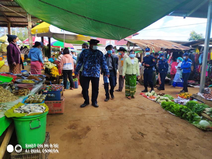 ထိုသို့ဆောင်ရွက်ရာတွင် မြို့နယ် ကိုဗစ်-၁၉ ထိန်းချုပ်ရေးနှင့် အရေးပေါ်တုံ့ပြန်ရေး ကော်မတီဝင် ဌာနဆိုင်ရာများ မြို့နယ်အထွေထွေအုပ်ချုပ်ရေး ဦးစီးဌာန၊ မြို့နယ်အဆင့် ဌာနဆိုင်ရာဝန်ထမ်းများ ၊ မြို့နယ်ရဲတပ်ဖွဲ့၊ မြို့နယ်မီးသတ်တပ်ဖွဲ့နှင့် ဈေးကော်မတီများ ပူးပေါင်း၍ ကူးစက်မှုနှုန်း များပြားလာသည့် အသက်ရှူလမ်းကြောင်းဆိုင်ရာ ကိုဗစ်-၁၉ ရောဂါ ကူးစက်ပြန့်နှံ့မှု မဖြစ်ပေါ်စေရေး အတွက် အသိပညာပေးလုပ်ငန်းများ အရှိန်အဟုန်မြှင့် ဆောင်ရွက်လျက်ရှိရာ နေအိမ်ပြင်ပသို့ ထွက်ခွာသွားလာနေသော ပြည်သူများ ဈေးရောင်းချသူများ၊ ဈေးဝယ်သူများနှင့် ခရီးသွားပြည်သူများ မဖြစ်မနေနှာခေါင်းစည်း (Mask) တပ်ဆင်ခြင်းရှိ/မရှိ နှင့် ကျန်းမာရေးနှင့် အားကစားဝန်ကြီးဌာနက ထုတ်ပြန်ထားသော ကိုဗစ်-၁၉ လမ်းညွှန်ချက်များ စည်းကမ်းချက်များကို အလေးထား လိုက်နာ နေထိုင်သွားလာမှု ရှိ/မရှိတို့ကို စစ်ဆေးပြီး နှာခေါင်းစည်း (Mask) တပ်ဆင်ခြင်း မရှိသူများအား ချက်ချင်းဝယ်ယူ တပ်ဆင်စေခဲ့ကြောင်း သိရသည်။