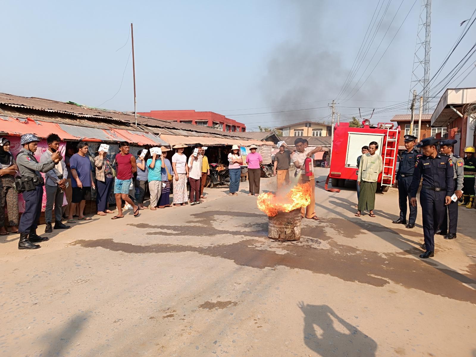 ရှေးဦးစွာ မီးသတ်ဦးစီးဌာန၊ မြို့နယ်ဦးစီးမှူးဦးဝင်းဇင်ဖြိုးက မီးအခြေခံသဘောတရား၊ မီးလောင်မှုအကြောင်းအရင်း၊ မီးလောင်မှုအမျိုးအစားများ၊ အရေးပေါ်မီးဘေးကြိုတင်ကာကွယ်ရေးဆိုင်ရာနည်းလမ်းများအကြောင်း အသိပညာပေးဟောပြောပြီး မြို့နယ်မီးသတ်တပ်ဖွဲ့ဝင်များက မီးငြှိမ်းသတ်နည်း၊ မီးသတ်ဆေးဗူးကိုင်တွယ်အသုံးပြုပုံနှင့် မီးဘေးကြိုတင်ကာကွယ်ရေး ဆိုင်ရာပစ္စည်းများအသုံးပြု၍ လက်တွေ့သရုပ်ပြသခဲ့သည်။