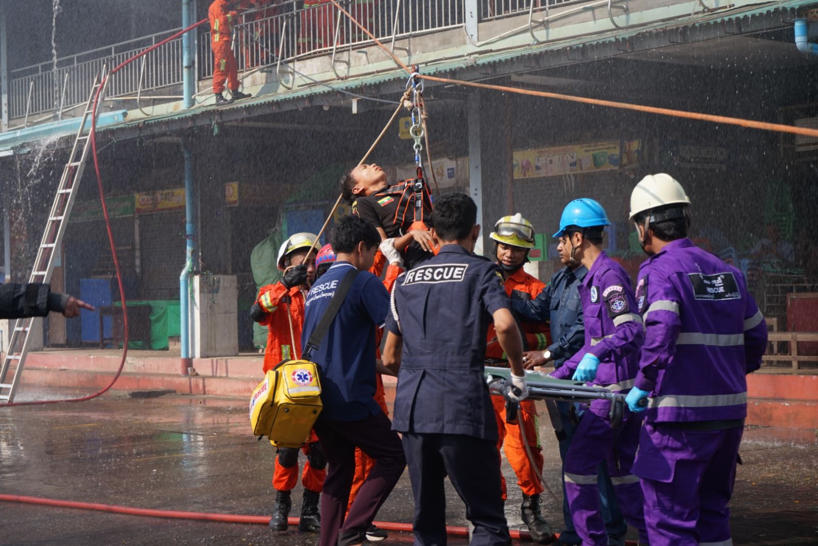 အခမ်းအနားတွင် သရုပ်ပြအဖွဲ့မှ ဈေးမီးငြှိမ်းသတ်ရေး ဇာတ်တိုက်လေ့ကျင့်သရုပ်ပြနေမှုများကို ပြည်နယ်ဝန်ကြီးချုပ်၊ ပြည်နယ်တရားလွှတ်တော် တရားသူကြီးချုပ်နှင့် ပြည်နယ်အစိုးရအဖွဲ့ဝင် ဝန်ကြီးများက ကြည့်ရှုအားပေးခဲ့သည်။