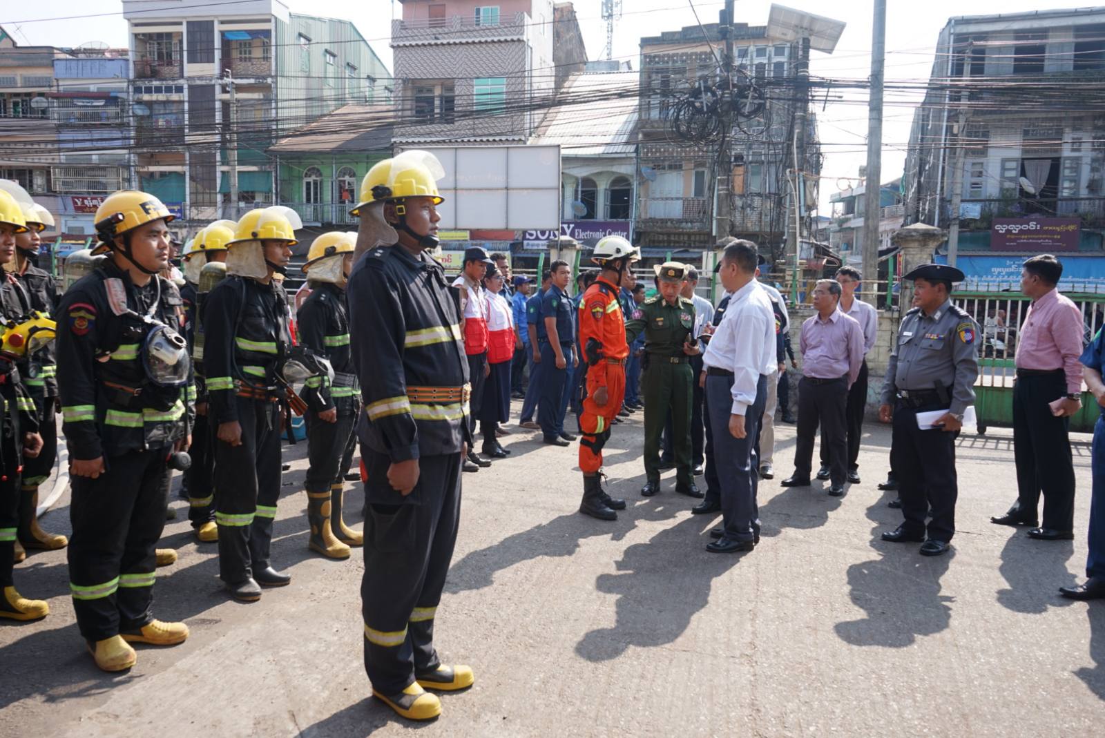 ထို့နောက် ပြည်နယ်ဝန်ကြီးချုပ်က ဈေးမီးငြှိမ်းသတ်ရေး သရုပ်ပြအဖွဲ့ဝင်များအား လမ်းညွှန်အမှာစကားပြောကြားရာတွင် ယခုကာလသည် ပူပြင်းခြောက်သွေ့သည့် ရာသီဥတဖြစ်သည်နှင့်အညီ မီးဘေးအန္တရာယ် စိုးရိမ်ရသည့်ကာလဖြစ်သောကြောင့် နေရာတိုင်း၊ ဒေသတိုင်းတွင် မီးဘေး အန္တရာယ်အတွက် ဂရုစိုက်ရမည်ဖြစ်ပြီး၊ မီးလောင်မှုမဖြစ်ပေါ်စေရန်အတွက် မီးဘေးကြိုတင် ကာကွယ်ရေးလုပ်ငန်းများကို အရှိန်အဟုန်မြှင့် ဆောင်ရွက်ကြရန်လိုအပ်ကြောင်း မီးလောင်ပါကလည်း အချိန်မီငြှိမ်းသတ်နိုင်ရေးအတွက် ပြင်ဆင်ထားရန် လိုအပ်ကြောင်း မီးလောင်မှုများတွင် ဈေးများ မီးလောင်မှုသည် ဆုံးရှုံးမှုတန်ဖိုးများပြားကြောင်း၊ ဈေးများ၌ မီးဘေးလုံခြုံရေးကို အထူးဂရုစိုက် ဆောင်ရွက်ကြရန်နှင့် အမှတ်(၁)ဈေးကြီး ဇာတ်တိုက် လေ့ကျင့်ခန်းတွင် ပါဝင် ဆောင်ရွက်ကြသော မီးသတ်တပ်ဖွဲ့၊ မြန်မာနိုင်ငံ ရဲတပ်ဖွဲ့၊ ယာဉ်ထိန်းတပ်ဖွဲ့၊ ကြက်ခြေနီတပ်ဖွဲ့၊ ကျန်းမာရေးဝန်ထမ်းများ၊ စည်ပင်သာယာ ဝန်ထမ်းများ၊ အထွေထွေအုပ်ချုပ်ရေးဦးစီးဌာနမှ ဝန်ထမ်းများနှင့် ဈေးသူ/သားများအား အထူးပင် ကျေးဇူးတင်ရှိကြောင်းနှင့် ယခုလို ဇာတ်တိုက်လေ့ကျင့်ခန်းမှတစ်ဆင့် အမှန်တကယ် ဖြစ်စဉ်များ၌ ထိခိုက်ဆုံးရှုံးမှုများ နည်းနိုင်သမျှ နည်းနိုင်အောင် ပူးပေါင်းဆောင်ရွက်သွားကြရန်၊ မီးဘေးအန္တရာယ်နှင့်အခြား သဘာဝဘေးအန္တရာယ်များမှ ကင်းဝေးပါစေလိုကြောင်း တိုက်တွန်း မှာကြားခဲ့သည်။