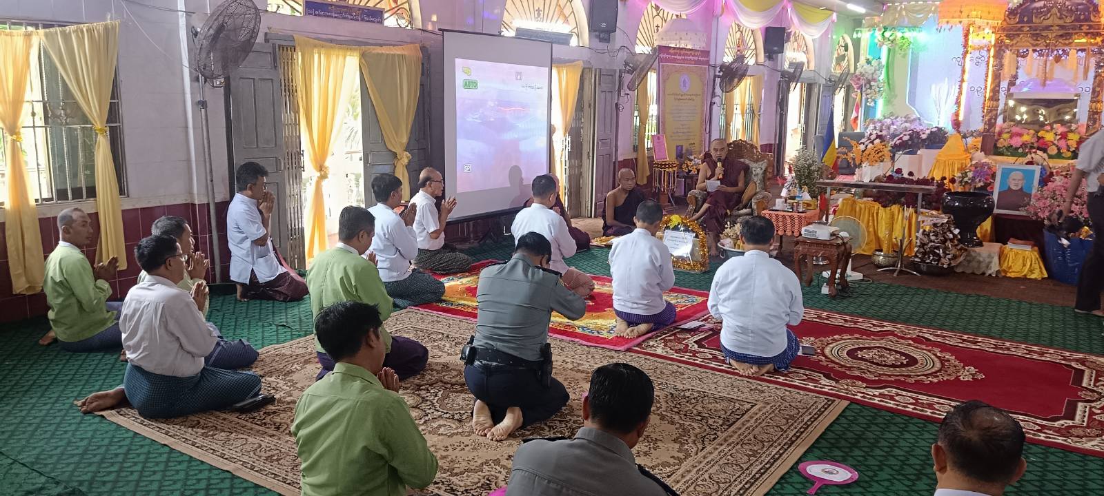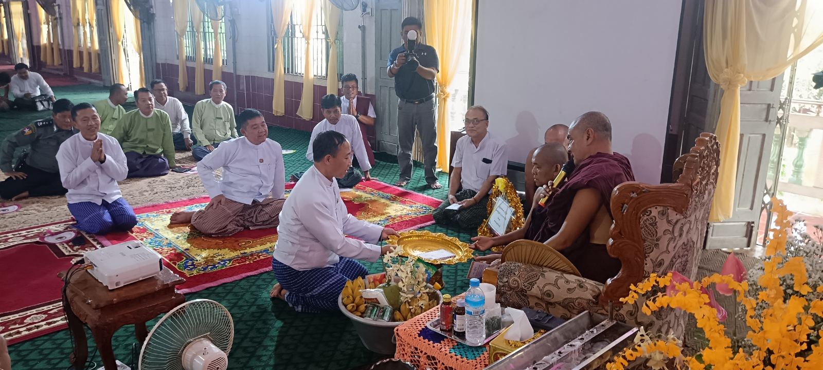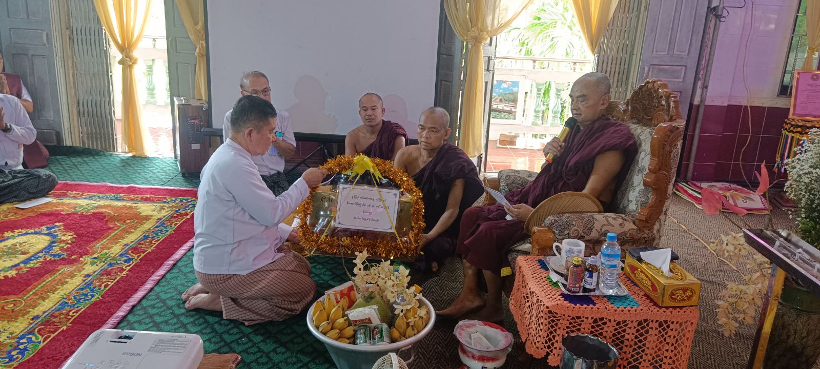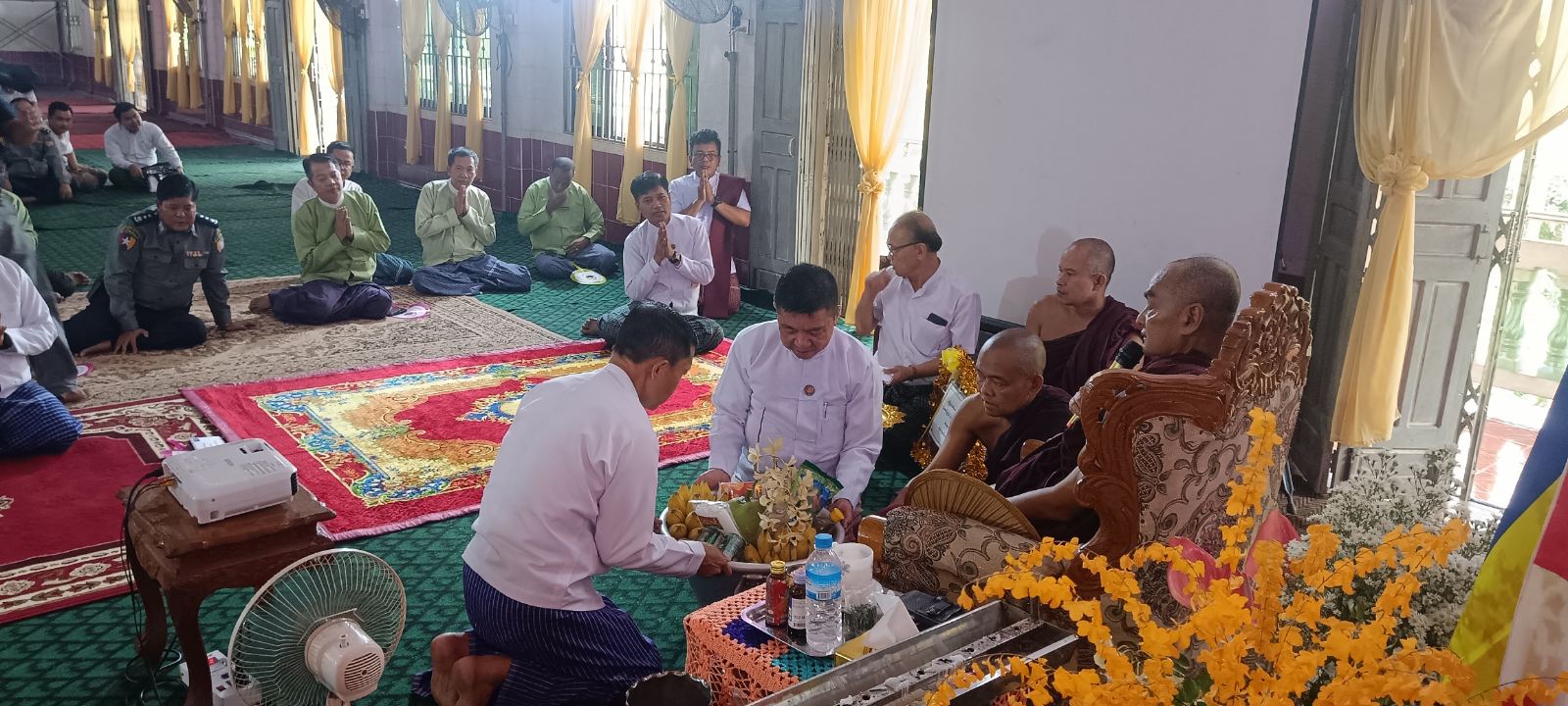 ထို့နောက် ခြင်္သေ့ကျောင်းတိုက် ဆရာတော် ဘဒ္ဒန္တစန္ဒကုမာရထံမှ ပြည်နယ်ဝန်ကြီးချုပ်၊ ပြည်နယ်အစိုးရအဖွဲ့ဝင်ဝန်ကြီးများနှင့်ဧည့်ပရိသတ်အပေါင်းတို့က ငါးပါးသီလခံယူ ဆောက်တည်ကြပြီး သြဝါဒကထာ ချီမြှင့်တော်မူခဲ့သည်။ ဆက်လက်၍ ဆရာတော်ကြီးအား လှူဖွယ်ပစ္စည်းနှင့် အလှူငွေများ ဆက်ကပ်လှူဒါန်းခဲ့ပြီး လှူဒါန်းမှုအစုစုတို့အတွက် ရေစက်သွန်းချအမျှပေးဝေခဲ့ကြောင်း သိရသည်။