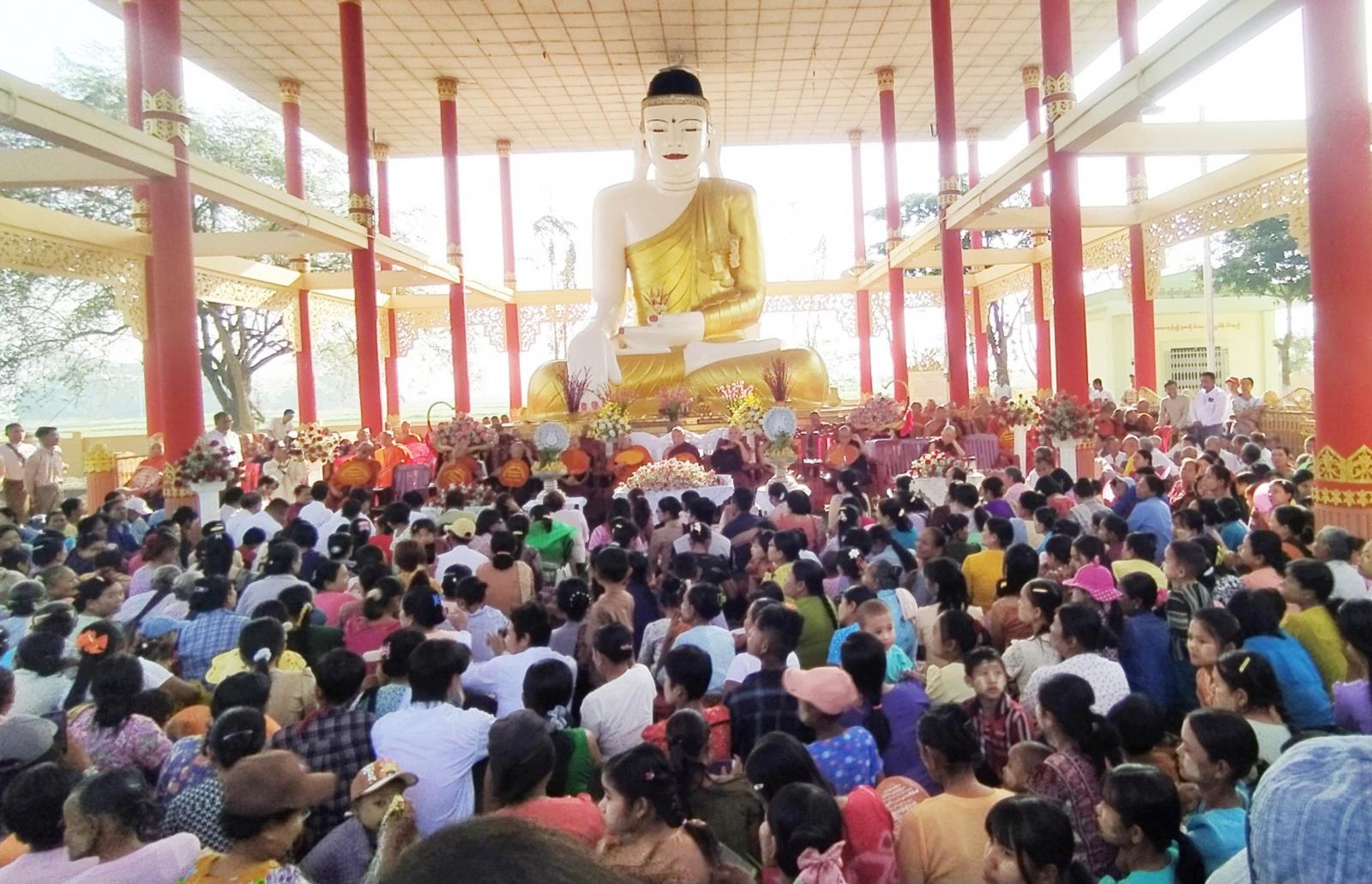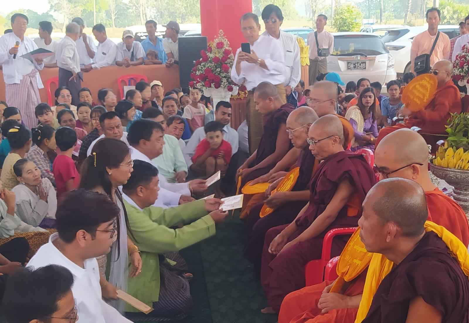 ဆက်လက်၍ မြို့နယ်စီမံအုပ်ချုပ်ရေးအဖွဲ့ဥက္ကဋ္ဌ ဦးစိုးမြင့်လှိုင်နှင့်ဇနီး၊ ရွှေကျောင်းအလှူရှင် မိသားစုတို့က သံဃာတော် ၁၁၁ ပါးအား ဝတ္ထုငွေများ ဆက်ကပ်လှူဒါန်းကြပြီး လှူဒါန်းမှုအစုစုအတွက် ရေစက်သွန်းချအမျှပေးဝေ၍ ဗုဒ္ဓသာသနံ စိရံတိဌတု သုံးကြိမ်ရွတ်ဆို အဓိဌာန်ပြုကာ အခမ်းအနားကို ရုတ်သိမ်းခဲ့ကြသည်။ ထို့နောက် သံဃာတော်များအား နေ့ဆွမ်းဆက်ကပ်၍ ဧည့်ပရိသတ်အပေါင်းအား နေ့လယ်စာတည်ခင်းဧည့်ခံ ကျွေးမွေးလှူဒါန်း ခဲ့ကြကြောင်း သိရသည်။