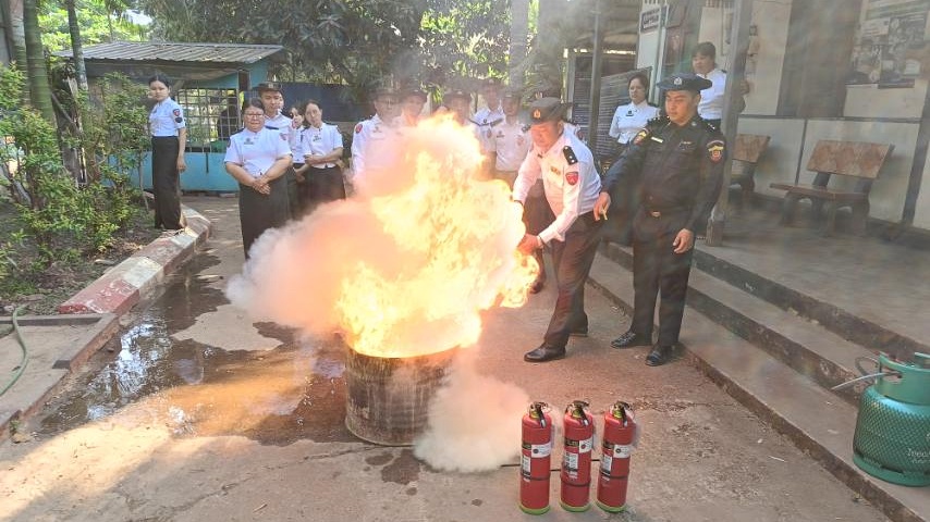 ဦးစွာ မြို့နယ်မီးသတ်ဦးစီးဌာနမှူး ဦးစီးအရာရှိ ဦးဖုန်းမြင့်အေးက မီးဘေးအန္တရာယ်မဖြစ်ပေါ်စေရန် ကြိုတင်ကာကွယ်ရမည့်အချက်များ၊ မီးသုံးစွဲရာတွင် လိုက်နာရမည့် စည်းကမ်းချက်များ ၊ မီးလောင်မှုဖြစ်ပွားပါက မီးငြှိမ်းသတ်ခြင်း ၊ သဲပုံး ၊ ရေပုံး ၊ မီး ချိတ်၊ မီးကပ်နှင့် မီးသတ်ဆေးဘူးများ စနစ်တကျသုံးစွဲရေး၊ မီးသတ်ဆေးဘူး ကိုင်တွယ်အသုံးပြုပုံနှင့် မီးဘေးလုံခြုံရေးဆိုင်ရာ အသုံးအဆောင်ပစ္စည်းများ စနစ်တကျထားရှိရေးကို ရှင်းလင်းဆွေးနွေးပြီး လက်တွေ့မီးငြှိမ်းသတ်နည်း သရုပ်ပြသခဲ့သည်။ ထို့နောက် ဝန်ထမ်းများက မီးဘေးအန္တရာယ် ကာကွယ်ရေးဆိုင်ရာအချက်များ၊ အရေးပေါ်ဆက်သွယ်ရမည့် ဖုန်းနံပါတ်များနှင့် မီးသတ်ဆေးဘူးအသုံးပြုပုံတို့ကို မေးမြန်းရာ မြို့နယ်မီးသတ်ဦးစီးဌာနမှူးက ပြန်လည်ရှင်းလင်းဖြေကြားပေးသည်။
