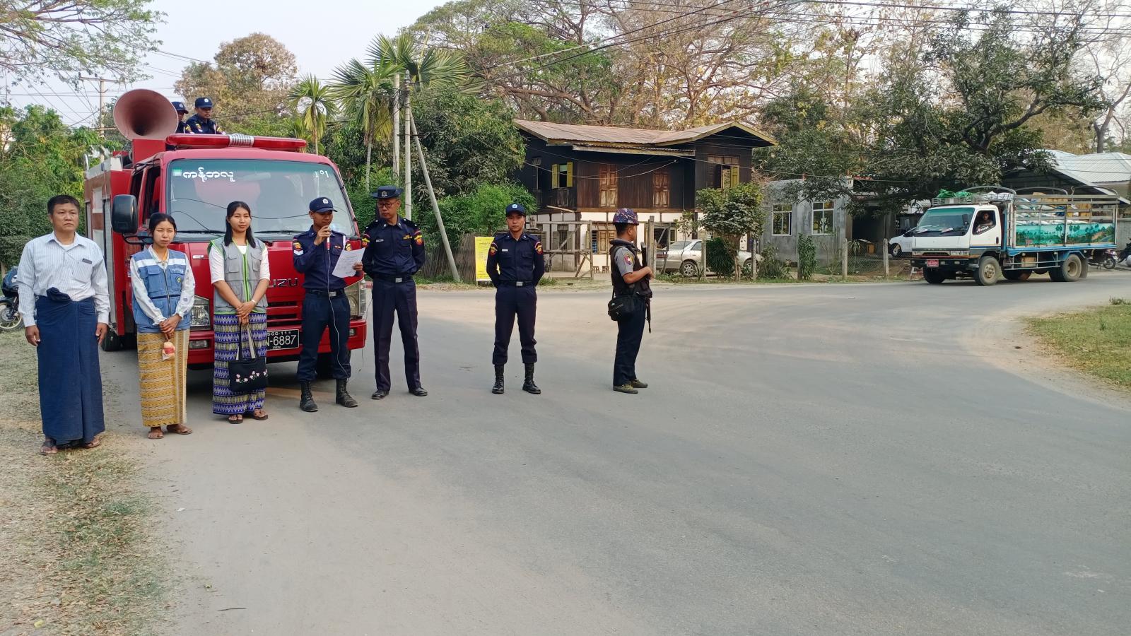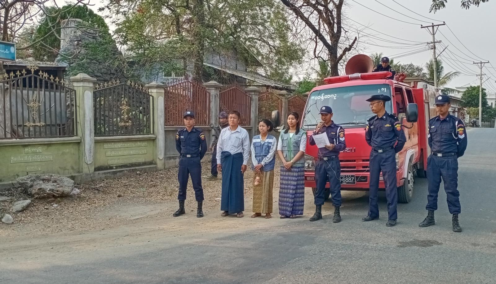 ထိုသို့အသိပေးနိုးဆော်ရာတွင် မြို့နယ်မီးသတ်ဦးစီးဌာန၊ ခရိုင်ဘေးအန္တရာယ်ဆိုင်ရာစီမံခန့်ခွဲမှုဦးစီးဌာန၊ ပညာရေးဌာနနှင့် မြန်မာနိုင်ငံရဲတပ်ဖွဲ့တို့မှ ရပ်ကွက်နေပြည်သူများ အမှိုက်များကို စနစ်တကျမီးရှို့ကြရန်နှင့် မီးရှို့မည်ဆိုပါက နံနက် ၄ နာရီမှ ၉ နာရီထိ၊ ညနေ ၄ နာရီမှ ၇ နာရီထိဆောင်ရွက်ကြရန်၊ မော်တော်ယာဥ် မောင်းနင်နေစဥ်၊ မော်တော်ဆိုင်ကယ်စီးနင်းနေစဥ်နှင့် လမ်းလျှောက်နေစဥ် ဆေးလိပ်သောက်ခြင်းမပြုလုပ်ကြရန်၊ ဆေးလိပ်တိုများကို စနစ်တကျစွန့်ပစ်ကြရန်၊ ဆူညံအိတ်ဇောများ တပ်ဆင်အသုံးမပြုကြရန်၊ မီးချိတ်၊ မီးကပ်၊ ရေ၊ သဲများကို စနစ်တကျစီမံဆောင်ရွက်ထားရန် အဆိုပါလုပ်ငန်းများကို လိုက်လံစစ်ဆေးသွားမည်ဖြစ်ပြီး တွေ့ရှိပါက တည်ဆဲဥပဒေများအရ အရေးယူဆောင်ရွက်သွားမည်ဖြစ်ကြောင်းတို့ကို အသိပေးနိုးဆော်ခဲ့ကြကြောင်း သိရသည်။