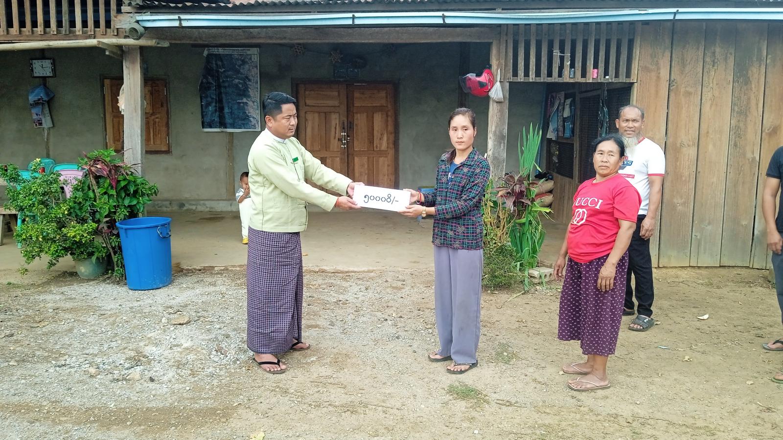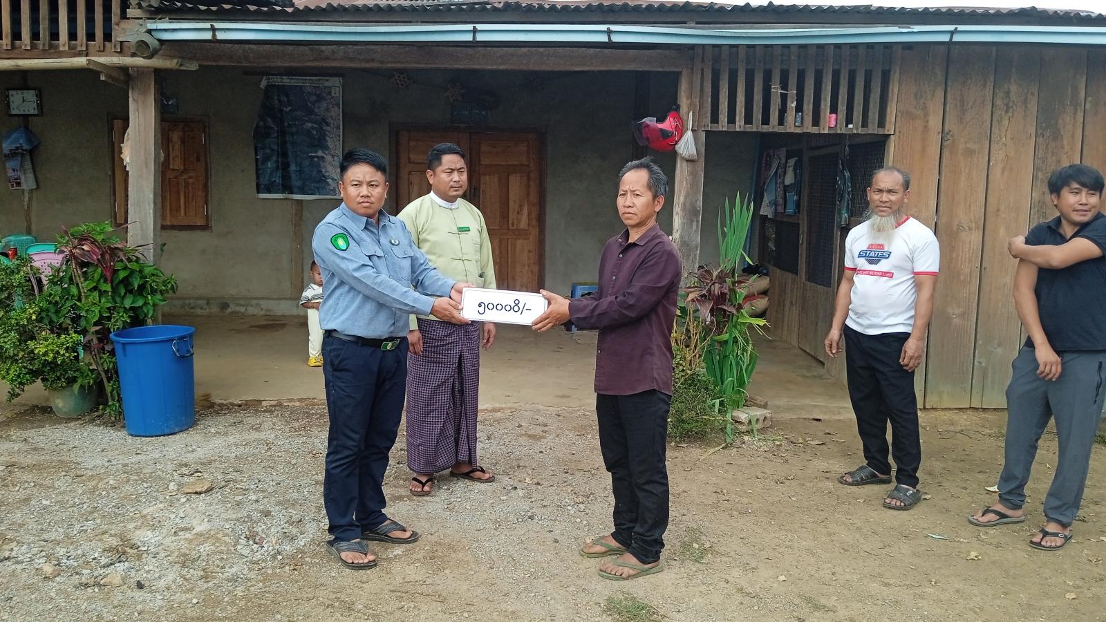 ထိုသို့ နိုင်ငံတော်မှ ထောက်ပံ့ပေးအပ်မှုအား မြို့အုပ်ချုပ်ရေးမှူး ဦးအောင်မင်းစိုးနှင့် တာဝန်ရှိသူများမှ ပျက်စီးသွားသော အိမ်ခြေ၊ အိမ်ထောင်စု(၁၀၈)ဦးတို့အတွက် အိမ်ထောင်စုတစ်စုလျှင် ငွေ (၅၀၀၀၀)ကျပ်ဖြင့် စုစုပေါင်း(၅၄၀၀၀၀၀)နှင့် ဆန်ရိက္ခာအတွက် (၁၃၆၂၉၀၀)ကျပ်၊ စုစုပေါင်း (၆၇၆၂၉၀၀)ကျပ်တို့အား ကျေးရွာပြည်သူများ လက်ဝယ်အရောက် ထောက်ပံ့ပေးအပ်ခဲ့ကြောင်း သိရသည်။