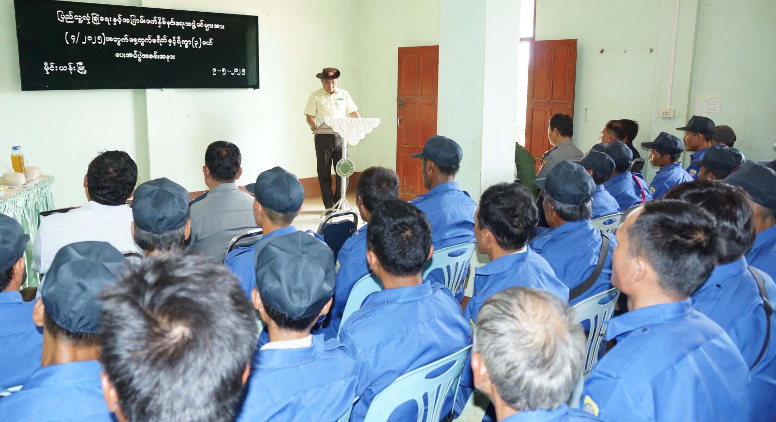 ထို့နောက် ခရိုင်စီမံအုပ်ချုပ်ရေးအဖွဲ့ဥက္ကဋ္ဌ ဦးလင်းသန့်မှ မြို့နယ်ပြည်သူ့လုံခြုံရေးနှင့် အကြမ်းဖတ်နှိမ်နင်းရေးအဖွဲ့ဝင်များ၏ ဝတ်စားဆင်ယင်မှုများအား လိုက်လံကြည့်ရှုစစ်ဆေးပြီး လိုအပ်ချက်များကို လမ်းညွှန်မှာကြားခဲ့ကြောင်း သိရသည်။