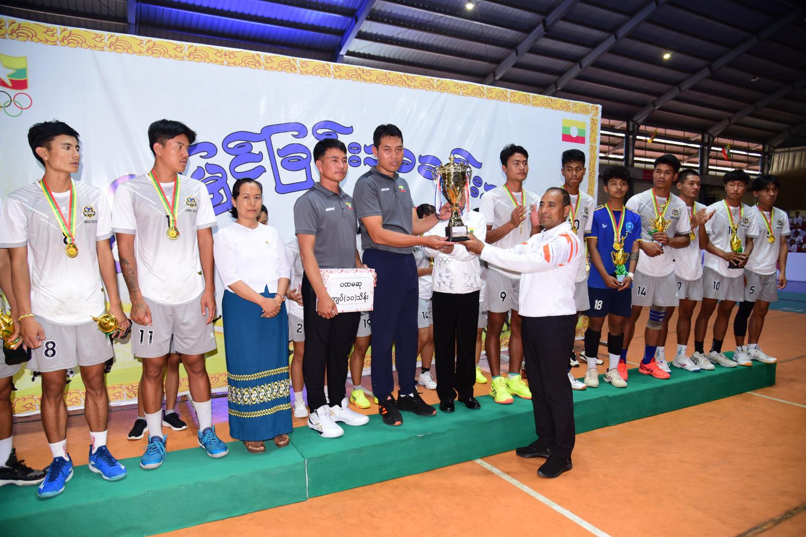 ဆက်လက်၍ အမျိုးသမီးဘော်လီဘော တတိယဆုရရှိသည့် လွိုင်ခရိုင်အသင်းအား တစ်ဦးချင်းဆုတံဆိပ်နှင့်ငွေသားဆုကို ပြည်နယ်ဥပဒေချုပ်ကလည်းကောင်း၊ အမျိုးသားဘော်လီဘောပြိုင်ပွဲ တတိယဆုရရှိသည့် ကျိုင်းတုံခရိုင်အသင်းအား တစ်ဦးချင်းဆုတံဆိပ်နှင့် ငွေသားဆုကို ပြည်နယ်တိုင်းရင်းသားရေးရာဝန်ကြီးကလည်းကောင်း၊ အမျိုးသမီးဘော်လီဘောပြိုင်ပွဲ ဒုတိယဆုရရှိသည့် လင်းခေးခရိုင်အသင်းအား တစ်ဦးချင်းဆုတံဆိပ်နှင့် ငွေသားဆုကို ပြည်နယ်လမ်းပန်းဆက်သွယ်ရေးဝန်ကြီးကလည်းကောင်း၊ အမျိုးသားဒုတိယဆုရ လွိုင်လင်ခရိုင်အသင်းအား တစ်ဦးချင်းဆုတံဆိပ်နှင့် ငွေသားဆုကို ပြည်နယ်သယံဇတရေးရာဝန်ကြီးကလည်းကောင်း၊ အမျိုးသမီးပထမဆုရတောင်ကြီးခရိုင်အသင်းအား တစ်ဦးချင်းဆုတံဆိပ်ကို ပြည်နယ်စီးပွားရေးဝန်ကြီးကလည်းကောင်း၊ အမျိုးသားပထမဆုရ တောင်ကြီးအသင်းအား တစ်ဦးချင်းဆုတံဆိပ်ကို ပြည်နယ်လုံခြုံရေးနှင့်နယ်စပ်ရေးရာဝန်ကြီးကလည်းကောင်း၊ အမျိုးသမီး၊ အမျိုးသားပထမဆုရရှိသည့် တောင်ကြီးခရိုင်အသင်းအား ငွေသားဆု၊ တံခွန်စိုက်ဖလားဆုတို့ကို ပြည်နယ်ဝန်ကြီးချုပ် ဦးအောင်အောင်တို့က အသီးသီးဆုများချီးမြှင့်ပေးကြကြောင်း သိရသည်။