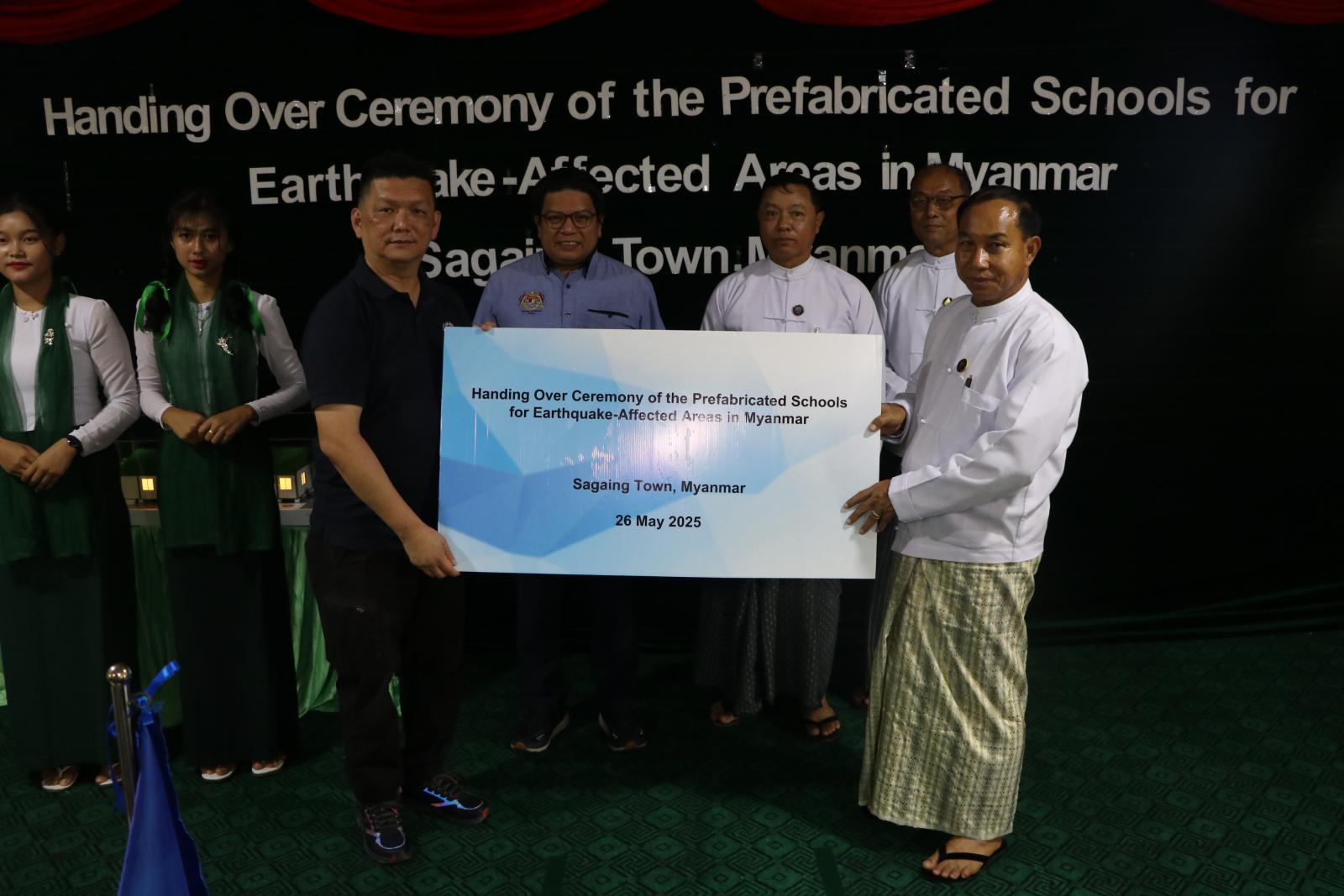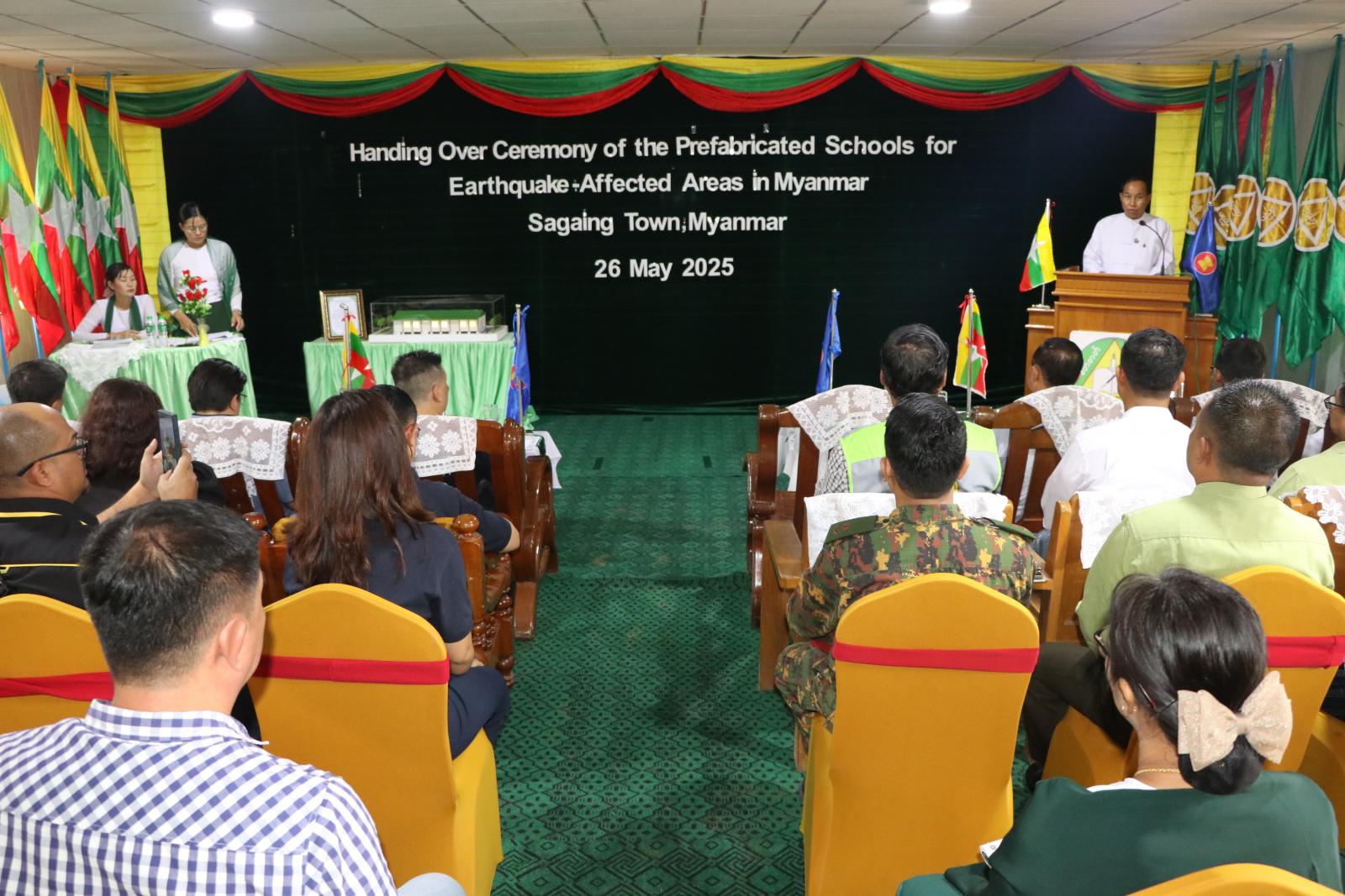 မန္တလေးငလျင်ကြီးကြောင့် ထိခိုက်ပျက်စီးခဲ့သည့် စစ်ကိုင်းမြို့ပေါ်ရှိ အခြေခံပညာကျောင်းများအတွက် အာဆီယံ The AHA Centre မှ ထောက်ပံ့လှူဒါန်းသည့် ကွန်တိန်နာကျောင်းဆောင် (Prefabricated Schools)များ လွှဲပြောင်းပေးအပ်ပွဲအခမ်းအနားကို မေလ ၂၆ ရက်၊ နံနက်ပိုင်းတွင် စစ်ကိုင်းမြို့၊ ရွာထောင်ရပ်ကွပ်ရှိ ဒီဇယ်အခြေခံပညာအလယ်တန်းကျောင်းတွင် ကျင်းပပြုလုပ်ရာ အခမ်းအနားသို့ စစ်ကိုင်တိုင်းဒေသကြီးဝန်ကြီးချုပ် ဦးမြတ်ကျော်၊ တိုင်းဒေသကြီးအစိုးရအဖွဲ့ဝင်များ၊ တိုင်းဒေသကြီး/ခရိုင်/မြို့နယ်အဆင့် ဌာနဆိုင်ရာများ၊ အာဆီယံ The AHA Centre ၏ အမှုဆောင်ညွှန်ကြားရေးမှူး Mr Lee Yam Ming နှင့် တာဝန်ရှိသူများ တက်ရောက်ကြသည်။