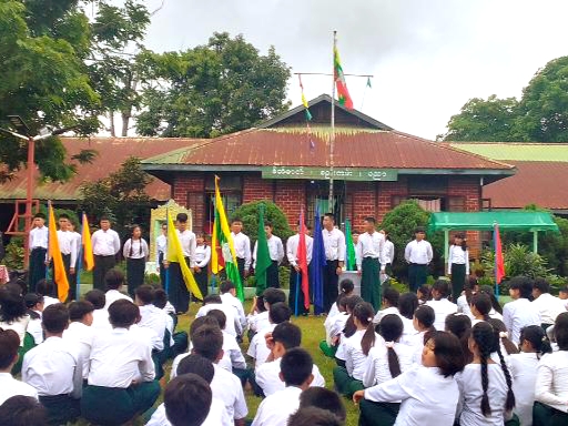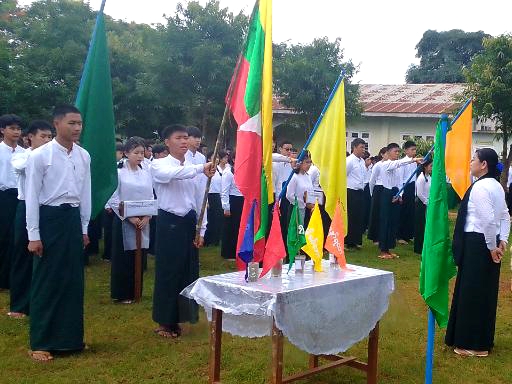 ထို့နောက် ကျောင်းကောင်စီဥက္ကဋ္ဌ ကျောင်းအုပ်ဆရာမကြီး ဒေါ်နန်းအိအိစံက တာဝန်အထိမ်းအမှတ် အလံများပေးအပ်ရာ တာဝန်ရှိသူ ဆရာ၊ ဆရာမများက အသင်းအလိုက်လက်ခံရယူကြပြီး နိုင်ငံတော်သီချင်းကို စုပေါင်းသံပြိုင်သီဆို၍ အခမ်းအနားပြီးမြောက်ခဲ့ကြောင်း သိရသည်။