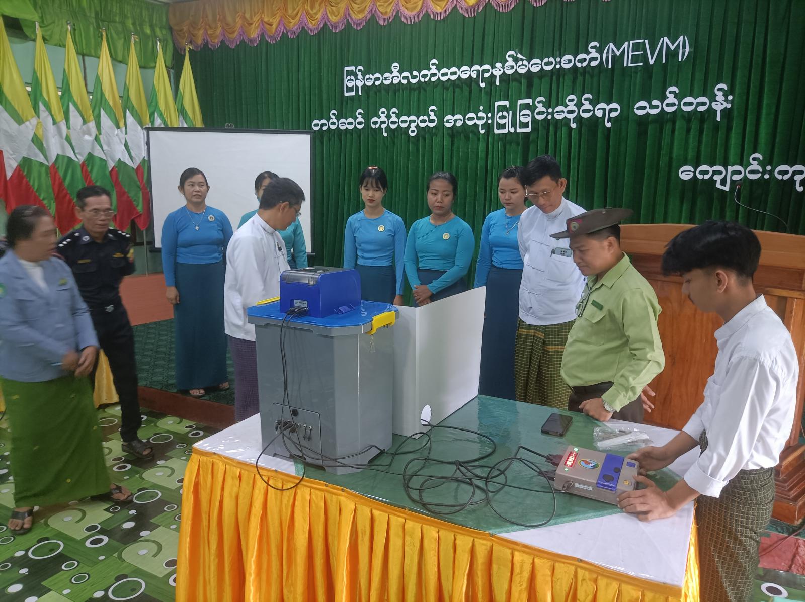 ထို့နောက် မြို့နယ်စီမံအုပ်ချုပ်ရေးအဖွဲ့နှင့် မြို့နယ်အမျိုးသမီးရေးရာအဖွဲ့တို့က မြန်မာအီလက်ထရောနစ်မဲပေးစက်(MEVM )အား လက်တွေ့စမ်းသပ် သရုပ်ပြမဲပေးခဲ့ကြသည်။ အခမ်းအနားသို့ မြို့နယ်အဆင့်မြန်မာအီလက်ထရောနစ်မဲပေးစက်(MEVM)ဆိုင်ရာ လုပ်ငန်းအဖွဲ့ဥက္ကဋ္ဌနှင့် အဖွဲ့ဝင်များ၊ မြို့နယ်အမျိုးသမီးရေးရာအဖွဲ့ဥက္ကဋ္ဌနှင့် အဖွဲ့ဝင်များ၊ သင်တန်းသား/သူများ တက်ရောက်ခဲ့ကြကြောင်း သိရသည်။