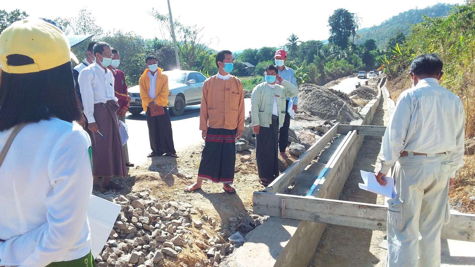 လွှတ်တော်ကိုယ်စားလှယ်များနှင့်အဖွဲ့သည် ဗိုလ်ချုပ်လမ်းကျောက်စီရေမြောင်း ပလပ်ဖောင်း တည်ဆောက်ခြင်းလုပ်ငန်းနှင့် လွတ်လပ်ရေးကျောက်တိုင်ကွင်းရင်ပြင် ကွန်ကရစ်ခင်းခြင်းလုပ်ငန်း၊ မယ်စဲ့-ဟိုစဲ့ လမ်းပေါ်ရှိ ကျောက်စီရေမြောင်း ပလပ်ဖောင်းအဆုံးနေရာတွင် ၂၄ ပေ Box Culvert တည်ဆောက်မည့်လုပ်ငန်း၊ မြောက်ပိုင်းရပ်ကွက် ဗိုလ်တိုက်ချွန်းလမ်း ကတ္တရာခင်းခြင်းလုပ်ငန်း ဆောင်ရွက်မည့်နေရာတို့အား ကြည့်ရှုစစ်ဆေးခဲ့ပြီး လုပ်ငန်းများ ဆောင်ရွက်ရာတွင် နိုင်ငံတော် ဘဏ္ဍာငွေများ လေလွင့်ဆုံးရှုံးမှုမရှိစေရေး ထိန်းသိမ်းကြပ်မတ်ကြရန် သက်ဆိုင်ရာဌာန ဆိုင်ရာများအား မှာကြားခဲ့သည်။