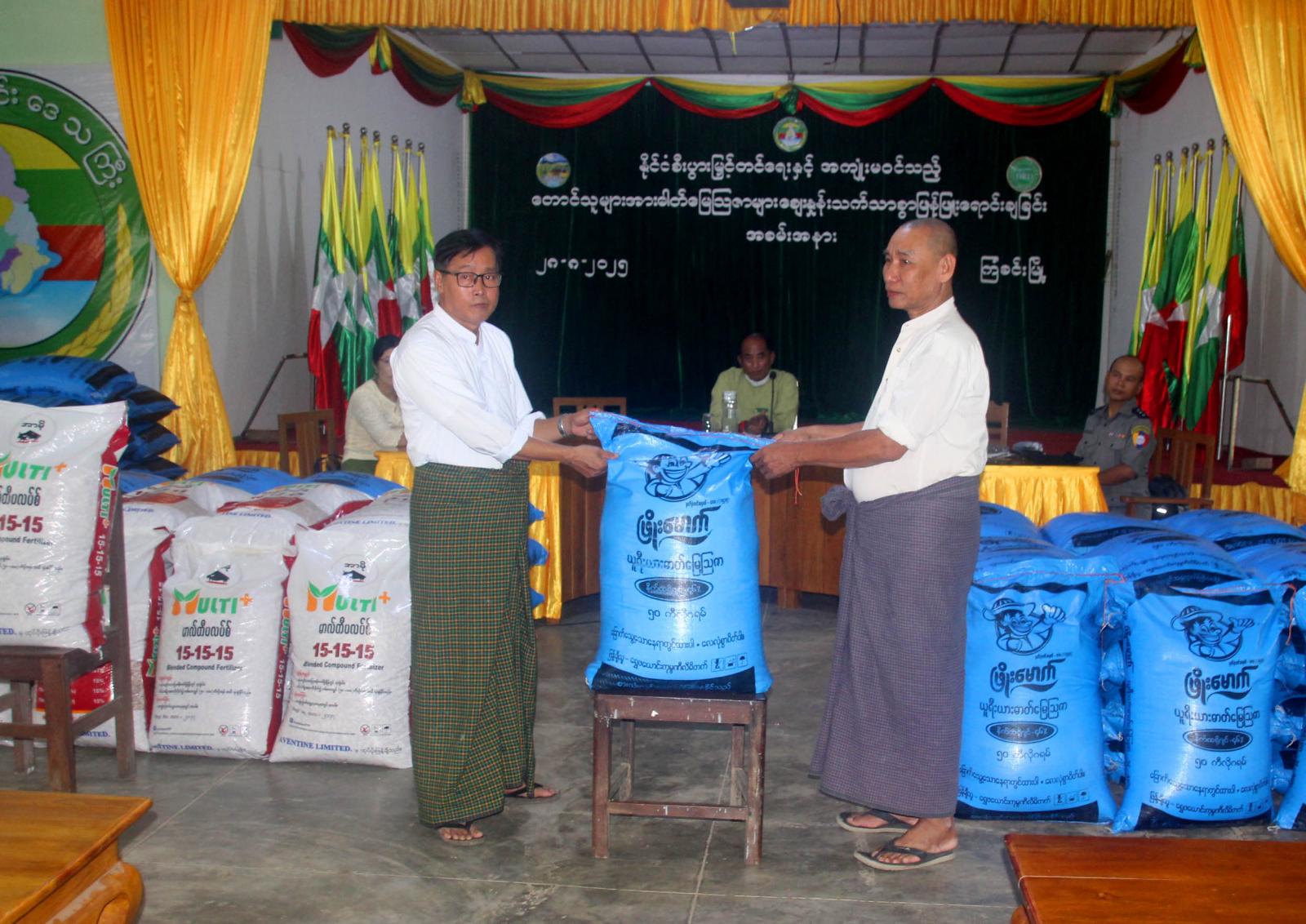 ဆက်လက်၍ မြို့နယ်စီမံခန့်ခွဲရေးနှင့်အုပ်ချုပ်ရေးကော်မတီဥက္ကဋ္ဌ ဦးဝင်းလှိုင်၊ အဖွဲ့ဝင် မြို့နယ်စီမံကိန်းဦးစီးမှူး ဒေါ်ချိုမာဝင်း၊ မြို့မစခန်းမှူး ဒုရဲမှူးလှခိုင်နှင့် မြို့နယ်မွေးမြူရေးနှင့် ကုသရေးဦးစီးဌာနမှ ဒေါက်တာဝင်းကိုတို့က အသီးသီးတောင်သူများအား အာမိုမာလ်တီပလ်စ်နှင့် ဖြိုးမောက်ယူရီးယား ပေးအပ်ကြသည်။ အဆိုပါ အာမိုမာလ်တီပလ်စ်(၁၅း၁၅း၁၅) ပတ်လည် ၁၄၂၂ အတ်၊ တစ်အိတ်လျှင်ငွေကျပ် ၁၂၀၀၀/-နှင့် ဖြိုးမောက်ယူရီးယား ၁၄၈၆ အိတ်၊ တစ်အိတ်လျှင် ငွေကျပ် ၈၉၅၀၀၀/- ဖြင့် ရောင်းချပေးသွားမည်ဖြစ်ကြောင်း သိရသည်။