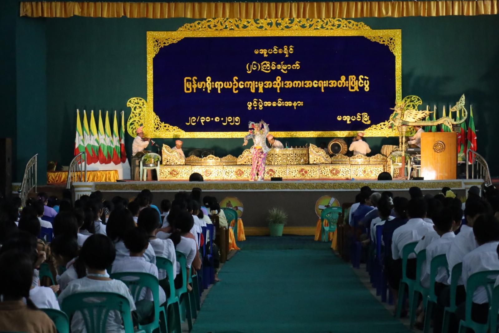 အခမ်းအနားအား ခရိုင်စီမံခန့်ခွဲရေးနှင့် အုပ်ချုပ်ရေးကော်မတီဥက္ကဋ္ဌဦးမြင့်နိုင်နှင့်အဖွဲ့ဝင်များမှ ဖဲကြိုးဖြတ်ဖွင့်လှစ်ပေးပြီး ခရိုင်စီမံခန့်ခွဲရေးနှင့် အုပ်ချုပ်ရေးကော်မတီဥက္ကဋ္ဌက အဖွင့်အမှာစကား ပြောကြားသည်။ ဆက်လက်၍ အခြေခံပညာအဆင့် (၁၅-၂၀) နှစ်မှ မရွှန်းလဲ့မေနှင့် အခြေခံပညာ (၁၀-၁၅)နှစ်မှ မဂျူးဂျူးအောင်တို့မှ နှလုံးသားကိုအလှဆင်ပါမယ်သီချင်းဖြင့်လည်းကောင်း၊ မောင်ဘုန်းမြတ်သုတမှ ဆိုင်းဝိုင်းဖြင့်လည်းကောင်း၊ သဘင်အစည်းအရုံး ဦးမောင်မောင်မြင့်မှ ညီတော်မင်းနန် ချွတ်ခန်းသီချင်းဖြင့်လည်းကောင်း၊ အဆင့်မြင့်ပညာမှ မောင်လှထွန်းခိုင်ဦးက အကဖြင့်လည်းကောင်း ဖျော်ဖြေခဲ့ကြသည်။ ယင်းနောက် ခရိုင်အဆင့် အဆို၊ အက၊ အရေး၊ အတီးပြိုင်ပွဲအား ဆက်လက်ကျင်းပရာ မအူပင်၊ ပန်းတနော်၊ ညောင်တုန်း၊ ဓနုဖြူမြို့နယ်များမှ အခြေခံပညာအဆင့်၊ အခြေခံပညာ (၁၀)နှစ်မှ (၁၅)နှစ်၊ အခြေခံပညာ (၁၅)နှစ်မှ (၂၀)နှစ် မဟာဂီတ၊ ခေတ်ဟောင်းတေး/ကာလပေါ်၊ အမျိုးဂုဏ်/ဇာတိဂုဏ် အဆိုဖြင့်လည်းကောင်း၊ အကပြိုင်ပွဲ၊ ကဗျာလွတ်အကဖြင့်လည်းကောင်း၊ အရေးဖြင့် လည်းကောင်း၊ တစ်ဦးချင်း ပတ္တလား၊ စန္ဒယား၊ ဆိုင်းဝိုင်း၊ တယော၊ မယ်ဒလင်၊ ဂီတာ၊ စောင်း၊ နှဲ ဖြင့်လည်းကောင်း၊ အဖွဲ့လိုက် အိုးစည်၊ ဆိုင်းဝိုင်းအတီးဖြင့်လည်းကောင်း ပါဝင်ယှဉ်ပြိုင်ခဲ့ကြသည်။