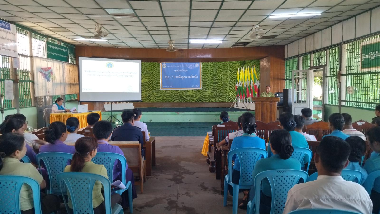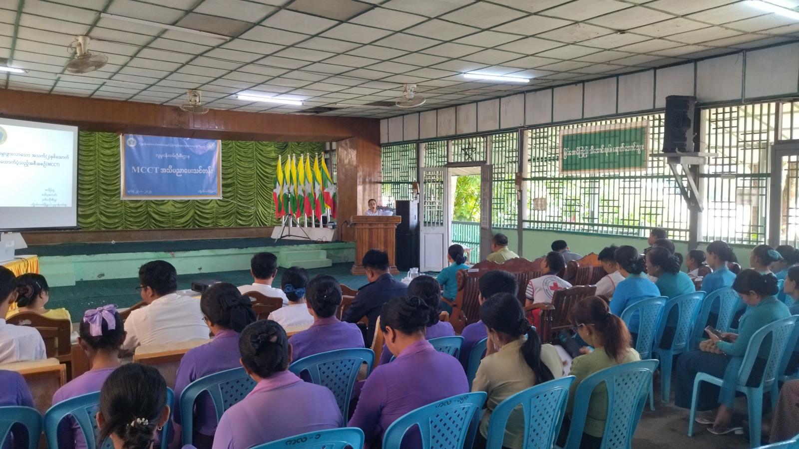 ဧရာဝတီတိုင်းဒေသကြီး၊ ဖျာပုံခရိုင်၊ ကျိုက်လတ်မြို့နယ် အထွေထွေအုပ်ချုပ်ရေးဦးစီးဌာနနှင့် လူမှုဝန်ထမ်းဦးစီးဌာနတို့ ပူးပေါင်းကာ ကိုယ်ဝန်ဆောင်မိခင်နှင့် ၎င်းတို့မှ မွေးဖွားသော အသက်(၂)နှစ်အောက် ကလေးငယ်များအား ငွေကြေးထောက်ပံ့သည့် အစီအစဉ် (MCCT)သင်တန်း ပို့ချခြင်းကို ဩဂုတ်လ(၂၉)ရက်၊ မွန်းလွဲပိုင်းက အထွေထွေအုပ်ချုပ်ရေးဦးစီးဌာန၊ ရွှေဝါလတ်ခန်းမ၌ ကျင်းပပြုလုပ်ခဲ့သည်။
