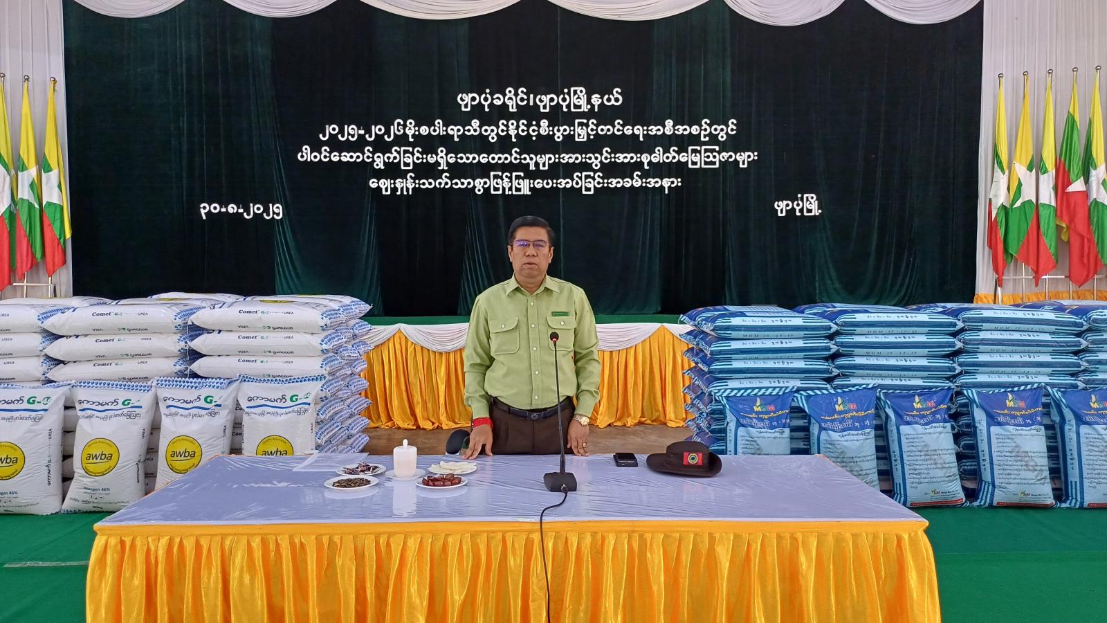ဧရာဝတီတိုင်းဒေသကြီး၊ ဖျာပုံခရိုင်၊ ဖျာပုံမြို့နယ်အတွင်းရှိ ၂၀၂၅-၂၀၂၆ခုနှစ် မိုးစပါးရာသီ နိုင်ငံ့စီးပွားမြှင့်တင်ရေးရန်ပုံငွေဖြင့် ဆောင်ရွက်ခြင်းမရှိသော မိုးစပါးစိုက်ပျိုးတောင်သူများအား ဈေးနှုန်းသက်သာစွာဖြင့် သွင်းအားစု ဓာတ်မြေဩဇာများ ဖြန့်ဖြူးပေးအပ်ခြင်း အခမ်းအနားကို ယမန်နေ့ နေ့လယ်ပိုင်းက ဖျာပုံမြို့ သီရိအဏ္ဏဝါခန်းမ၌ ကျင်းပပြုလုပ်သည်။