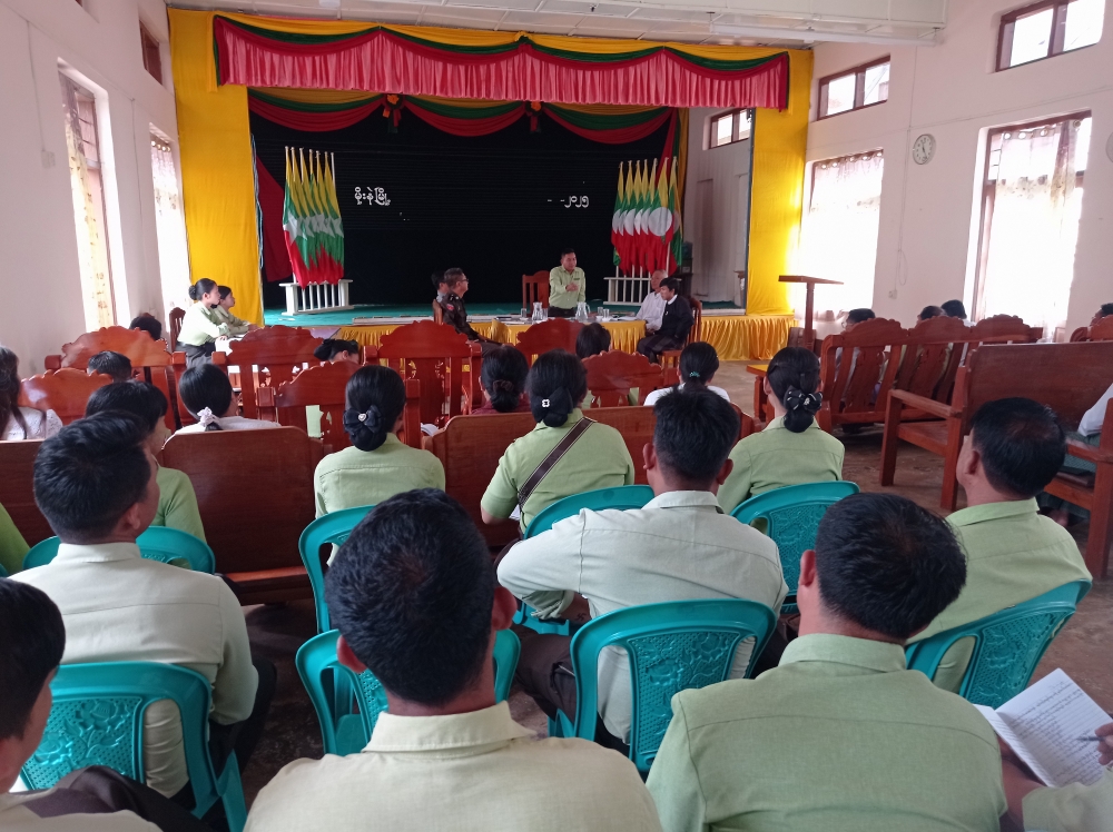 အခမ်းအနားတွင် မြို့နယ်စီမံခန့်ခွဲရေးနှင့်အုပ်ချုပ်ရေးကော်မတီဥက္ကဋ္ဌ ဦးဝင်းမြင့်က ၂၀၂၅-၂၀၂၆ ဘဏ္ဍာရေးနှစ်အတွက် စီမံကိန်းလျာထားချက်များပြည့်မီရေး၊ သဘာဝဘေးအန္တရာယ်များ ကြိုတင်ကာကွယ်ရေး စီမံဆောင်ရွက်ထားရှိရေး၊ ရုံး/ဌာန ပတ်ဝန်းကျင်သန့်ရှင်းသာယာလှပရေးနှင့် မြို့သန့်ရှင်းသာယာလှပရေး အပတ်စဉ်သန့်ရှင်းရေး ဆောင်ရွက်နိုင်ရေး၊ လူဦးရေကိန်းကဏန်းများ မှန်ကန်မှုရှိစေရေး၊ နေရပ်စွန့်ခွာ ပြည်သူများ လူဦးရေစာရင်းမှန်ကန်ရေး၊ ဌာနဆိုင်ရာဝန်ထမ်းများအနေဖြင့် ဝန်ထမ်းကျင့်ဝတ်၊ စည်းကမ်းများ လိုက်နာပြီး တာဝန်ကို ကျေပွန်စွာထမ်းဆောင်နိုင်ရေး၊ ကျောင်းပေါင်းစုံဘောလုံးပြိုင်ပွဲ ကျင်းပနိုင်ရေးနှင့် သဘာဝဘေးအန္တရာယ်ကြုံတွေ့လာပါက ချက်ချင်းတုံ့ပြန်ဆောင်ရွက်နိုင်ရေးနှင့် မိမိတို့ဌာနလုပ်ငန်းများအလိုက် ပေါင်းစပ်ညှိနှိုင်းဆောင်ရွက်ပေးရန်ရှိပါက ဆွေးနွေးပေးကြရန်စသည်ဖြင့် အဖွင့်အမှာစကား ပြောကြားခဲ့ပြီး အတွင်းရေးမှူး မြို့နယ်ရဲတပ်ဖွဲ့မှူး ရဲမှူးသန်းစိုးက ပါတီစုံဒီမိုကရေစီ အထွေထွေရွေးကောက်ပွဲများကို နှောင့်ယှက်ဟန့်တားပျက်ဆီးခြင်းမှ ကာကွယ်ခြင်းဥပဒေကို ဖတ်ကြားရှင်းလင်းခဲ့သည်။