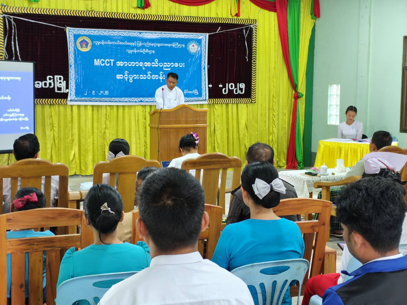 ရှမ်းပြည်နယ်(အရှေ့ပိုင်း)၊ ကျိုင်းတုံခရိုင်၊ မိုင်းခတ်မြို့နယ်တွင် ခရိုင်လူမှုဝန်ထမ်းဦးစီးဌာနမှ ကြီးမှူးကျင်းပသော (MCCT)အာဟာရ အသိပညာပေးဆင့်ပွားသင်တန်း အခမ်းအနားကို ယနေ့နံနက်(၁၀)နာရီက မြို့နယ်အထွေထွေအုပ်ချုပ်ရေးဦးစီးဌာန၊ အစည်းအဝေးခန်းမ၌ ကျင်းပပြုလုပ်ကြောင်း သိရသည်။